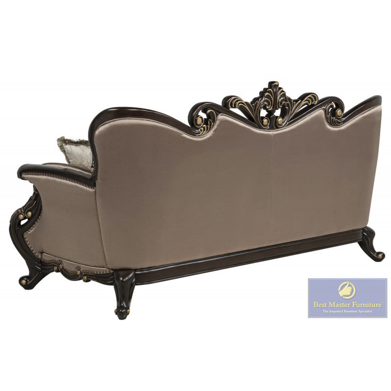 Transform your space with the TLR01 Sofa Set, a refined collection that marries classical Victorian aesthetics with superior construction quality. This distinguished ensemble features a meticulously carved hardwood frame finished in deep espresso tones, complemented by gilded embellishments that catch the light beautifully. The sumptuous satin upholstery pairs seamlessly with button-tufted detailing across the backrest, while gracefully curved armrests and ornamental base molding enhance its sophisticated presence. Includes coordinating decorative pillows to complete the curated design. An exceptional choice for discerning homeowners seeking timeless elegance in formal living spaces.