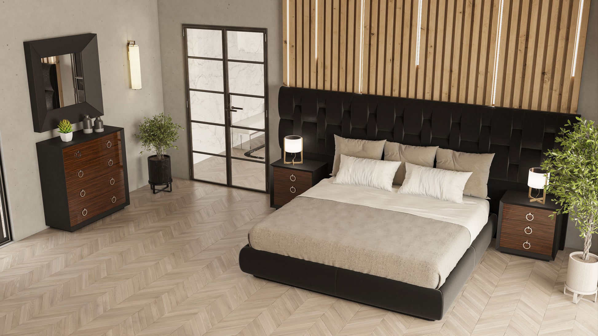 El glamuroso acabado de alta gama le dará a su dormitorio un aspecto impresionante. En el juego estándar que se ofrece hay una cama con almacenaje Queen Size, 2 mesas de noche, una cómoda y un espejo.