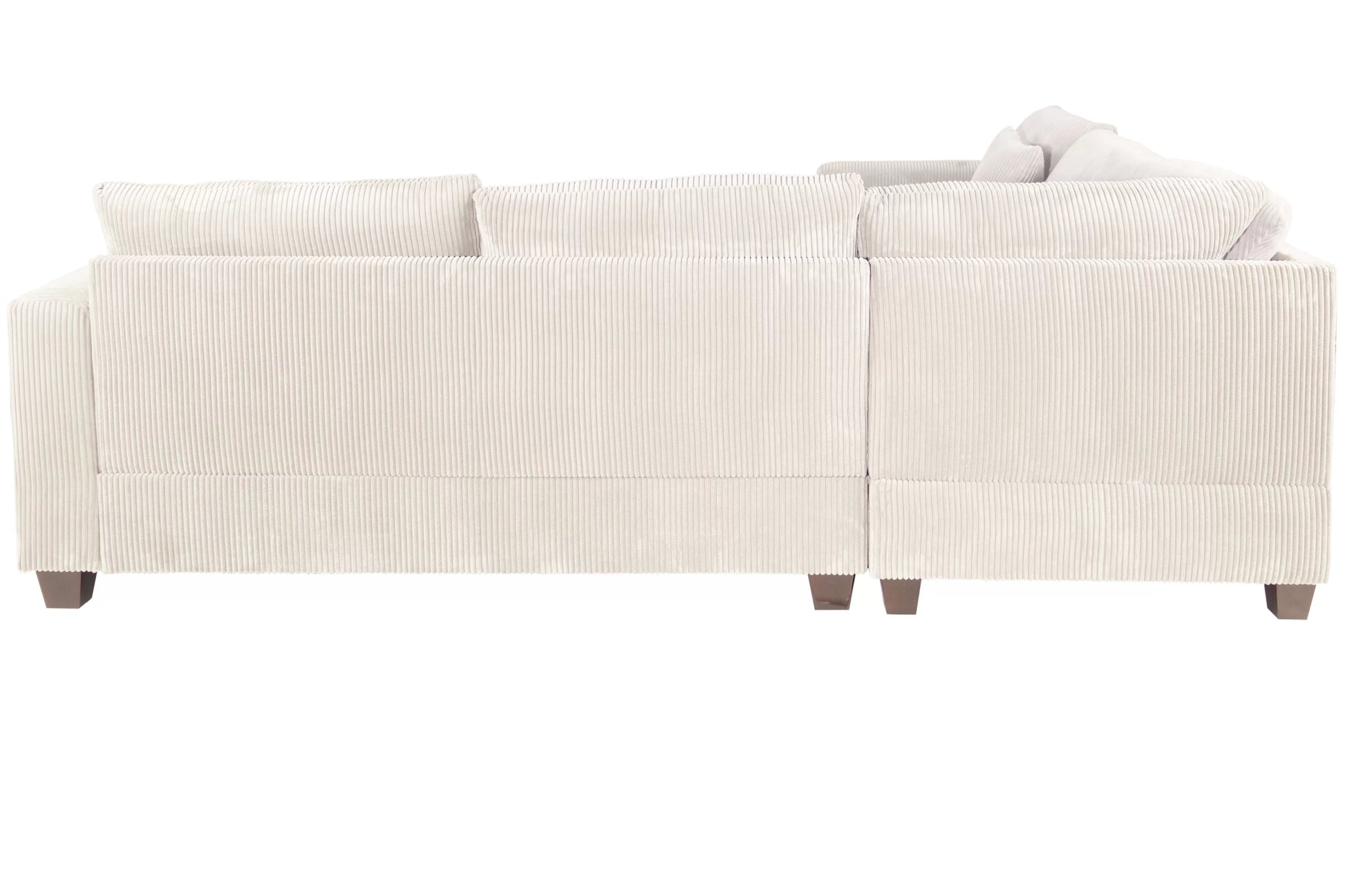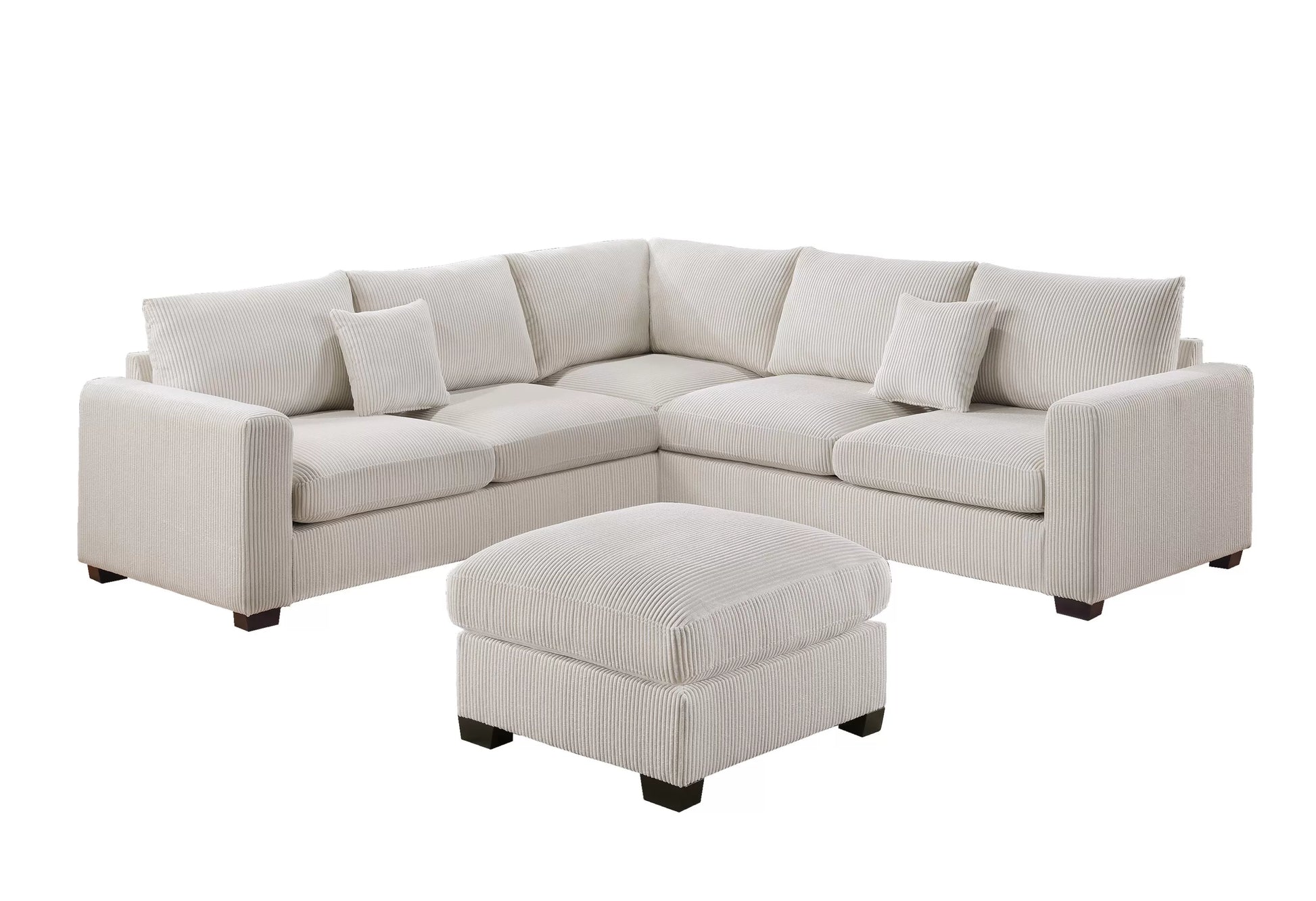 This 4-piece sectional in soft ivory corduroy offers generous seating with an L-shaped design that adapts to any room. The plush back cushions and square arms deliver both comfort and contemporary style, while the included ottoman doubles as a footrest or extra seating. Low-profile legs create a sleek, grounded look perfect for modern and transitional spaces. Complete with matching throw pillows, this sectional transforms your living area into an inviting gathering spot.