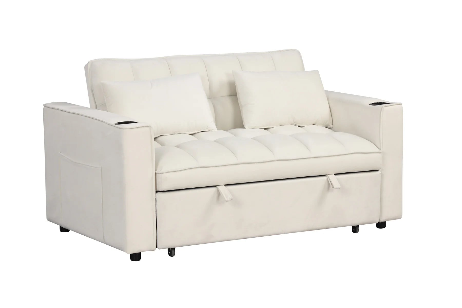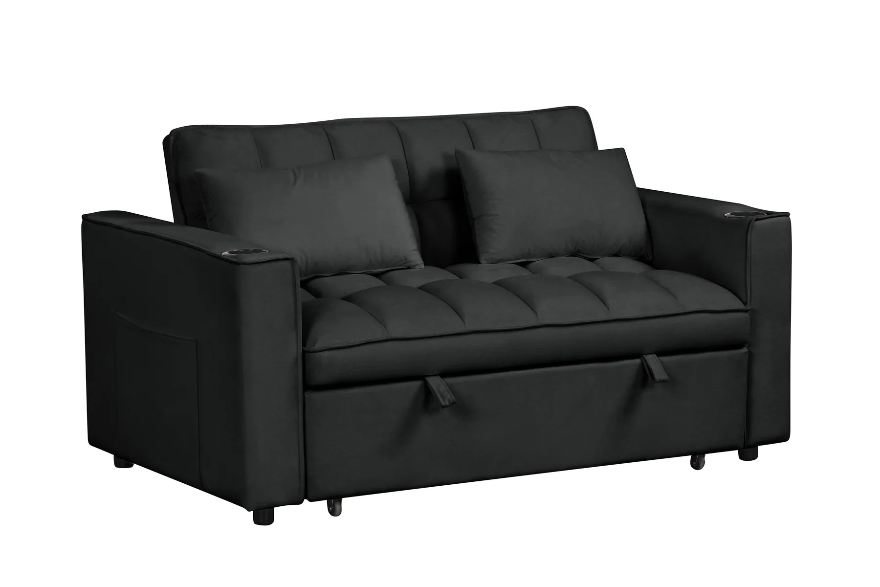 **Pull out sofa bed w/cup holder & pillows, Velvet in Black, White or Grey Pullout Sofa Bed 2 Toss Pillows Included Armrest Cup Holders Right Side Facing USB Charging Port Side Magazine Holder