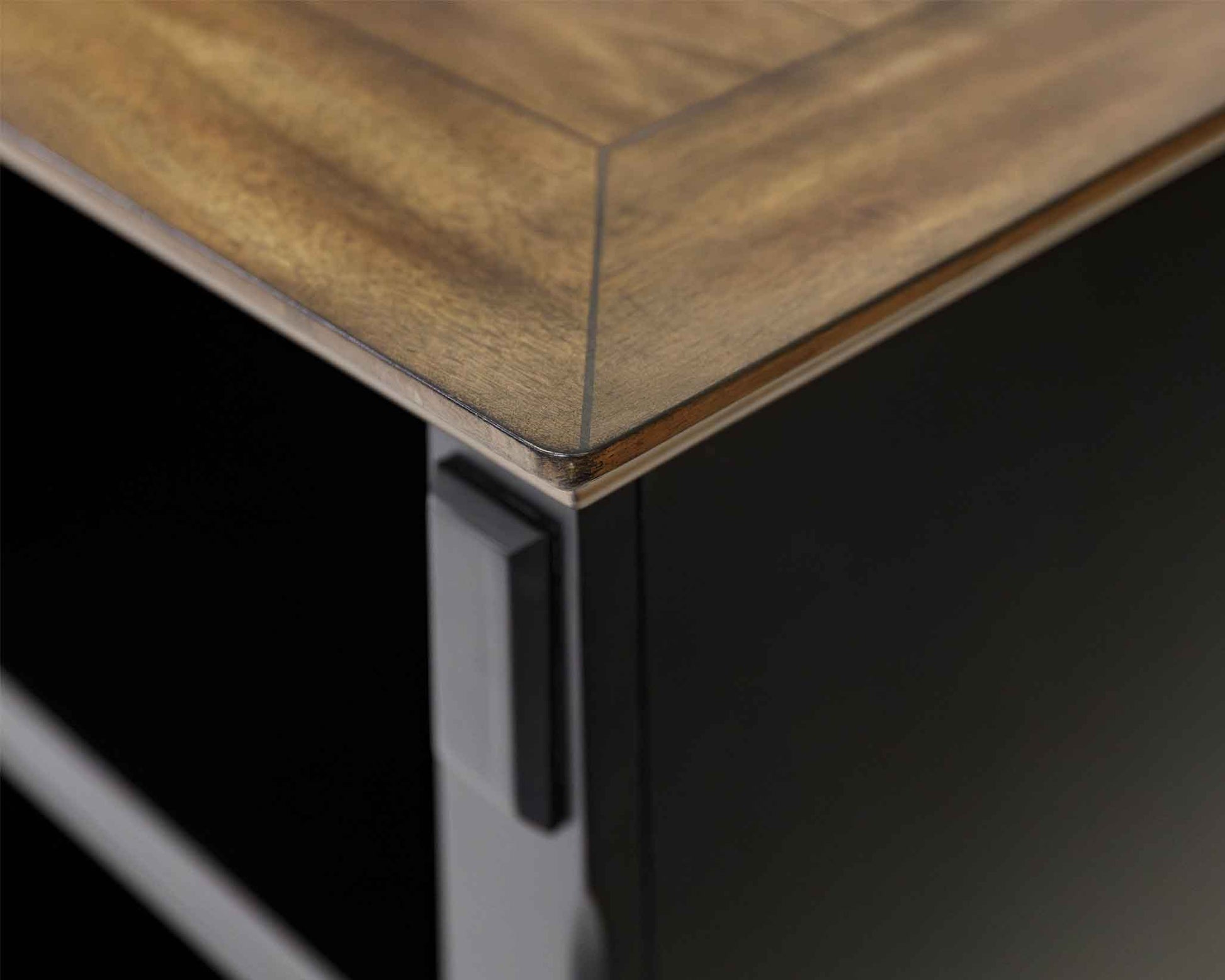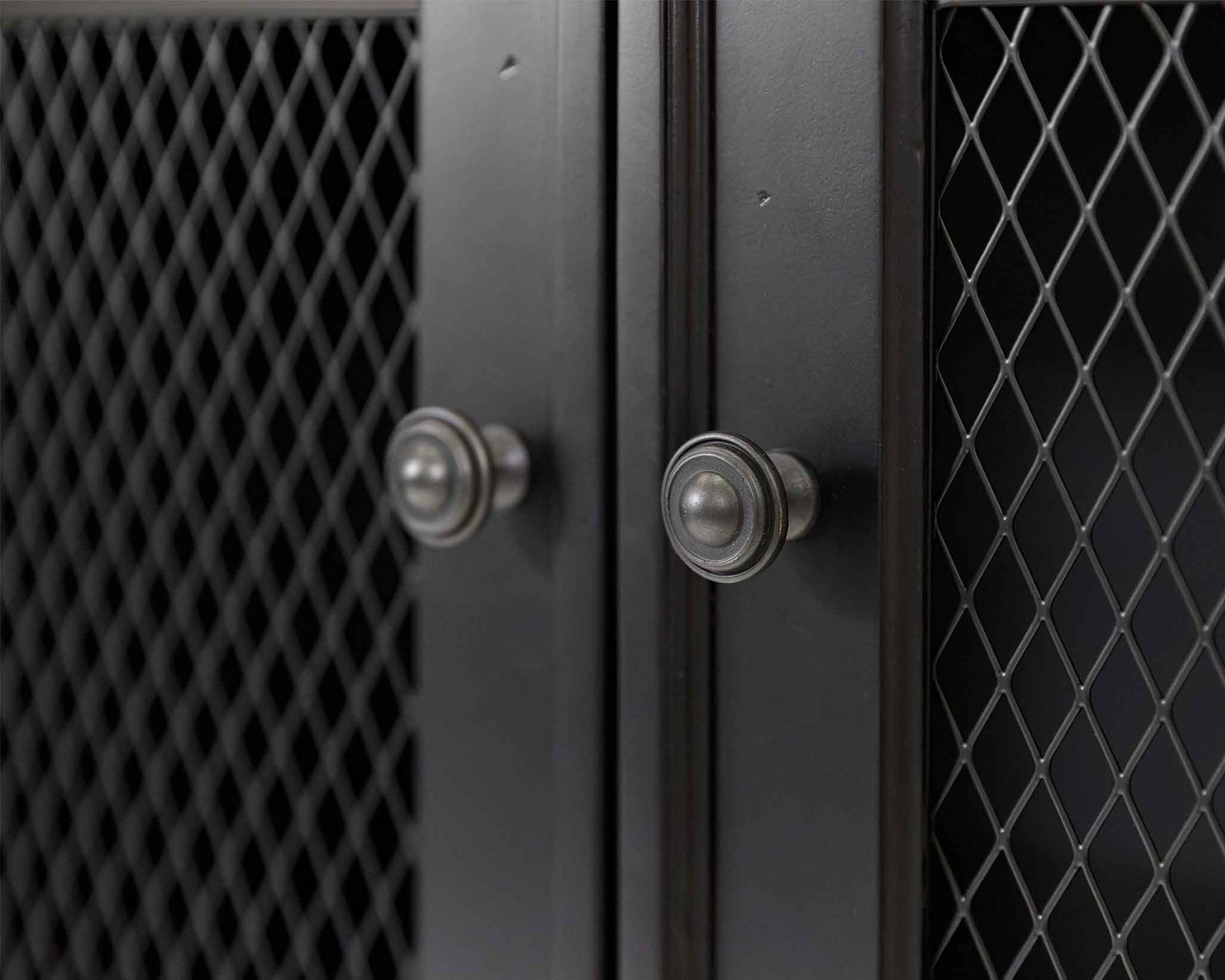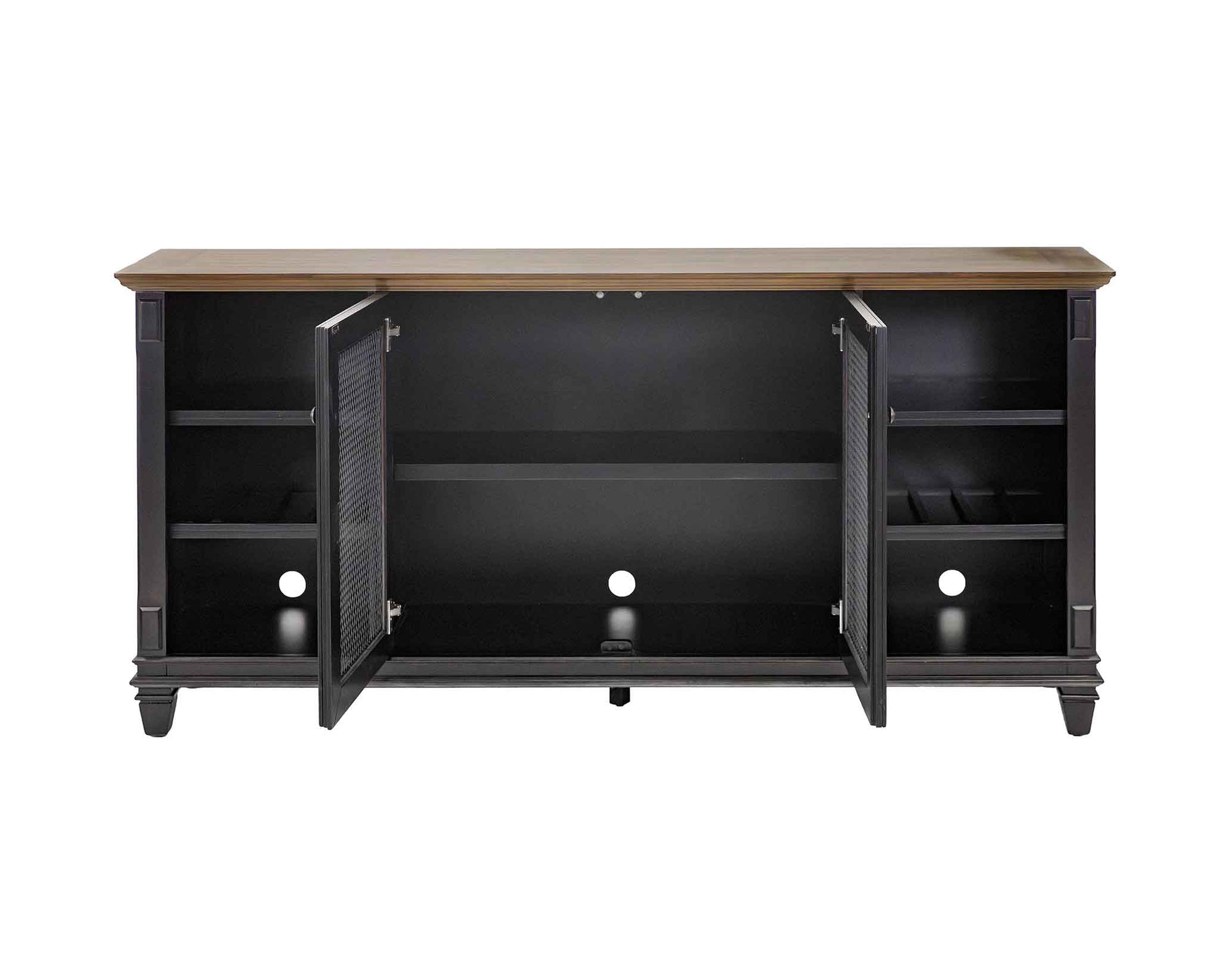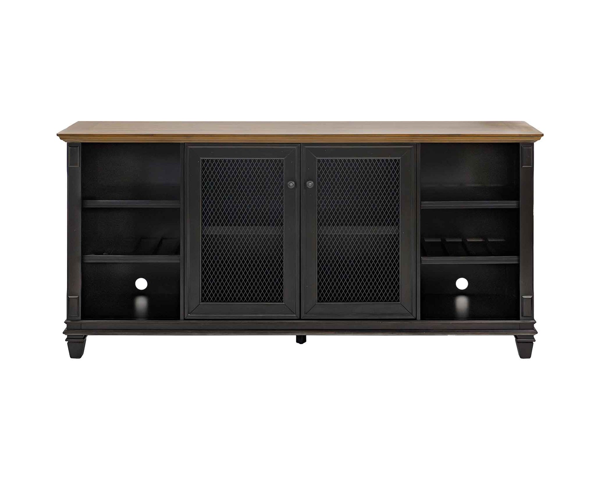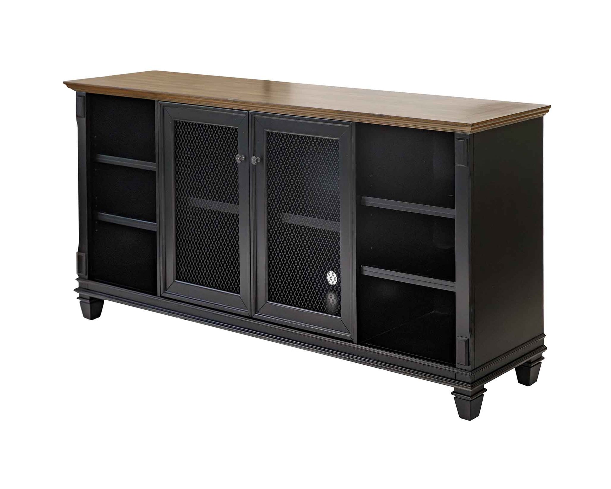 The cabinets are finished in a vintage, hand-rubbed black & feature wood plank tops lending a relaxed old-world feeling. Wire mesh doors accentuate the finish.