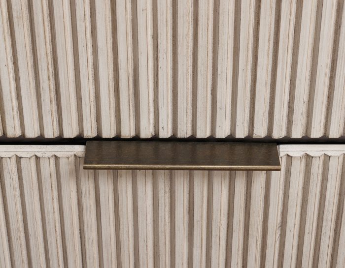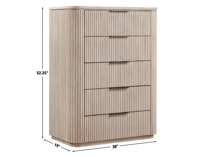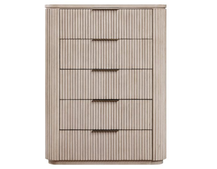 Experience the perfect combination of style and practicality with the Henry 5 Drawer Reeded Chest HEN900TC. Expertly crafted with oak veneers, Asian hardwoods, and engineered woods, this chest features reeded surfaces, rounded corners, and a sturdy plinth base. With five drawers, including a felt-lined top drawer, this chest provides ample, organized storage. Side metal glides allow for smooth operation, while safety stops prevent accidental removal. Constructed using kiln-dried wood and mortise-and-tenon joinery, this chest is built for exceptional stability. The hand-stained tan finish showcases the natural grain, and oil-rubbed brass pulls add a sophisticated touch. For added safety, an anti-tip restraint kit is included.