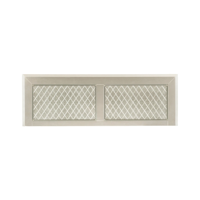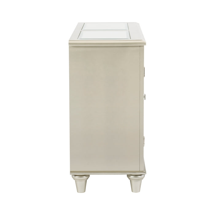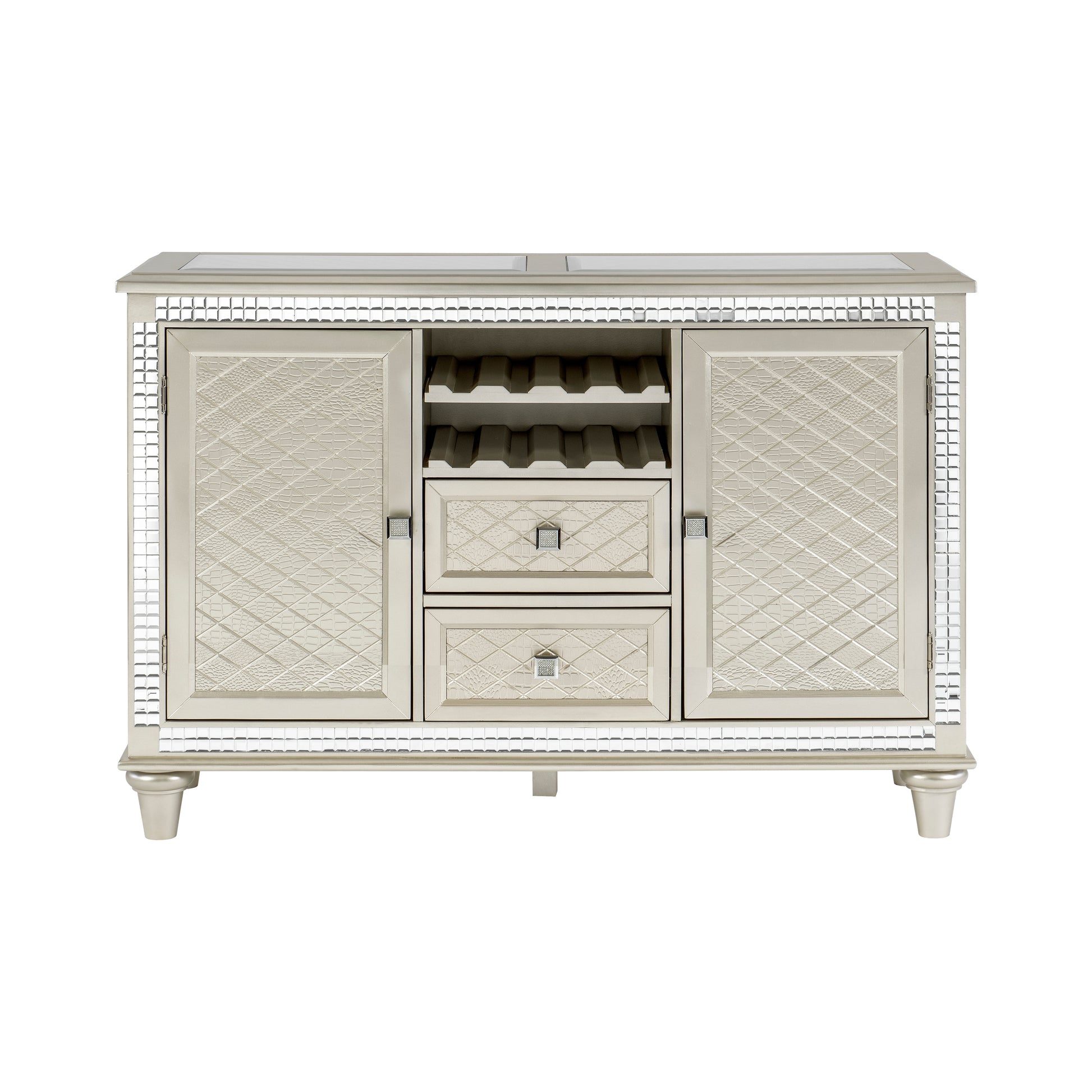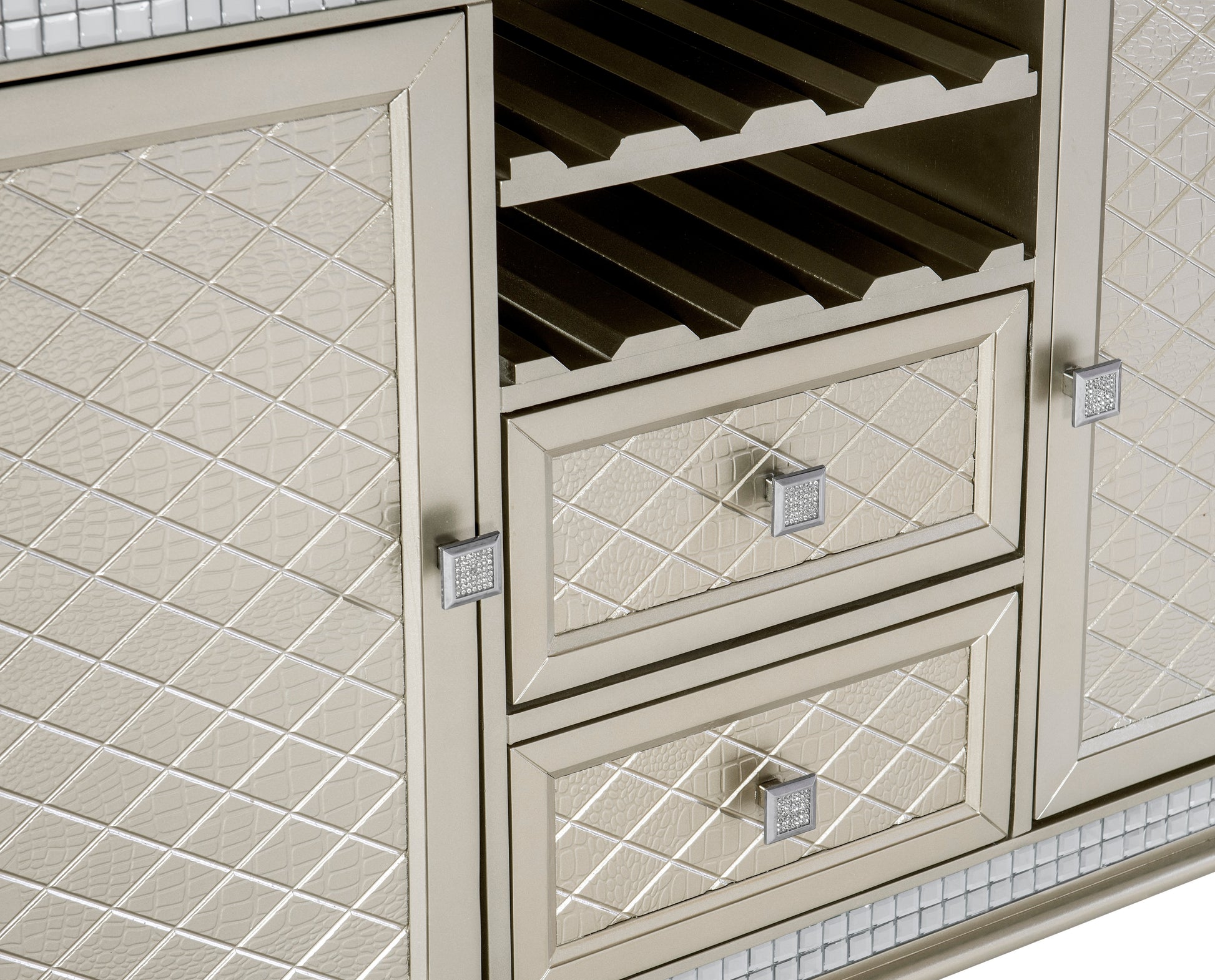 El borde del espejo del servidor refleja el acabado plateado de la colección. Paneles de vidrio insertados en la parte superior del servidor, mostrando la superficie en relieve y con patrón de diamantes. Los elegantes pies torneados añaden un toque de estilo tradicional mientras que los elementos decorativos crean una estética glamorosa. Los frentes de cajones y puertas en relieve, acentuados por patrones de diamantes y perillas realzadas con cristales, agregan un toque de lujo. Además, el servidor cuenta con un estante para botellas de vino para exhibir abiertamente sus cosechas favoritas.
