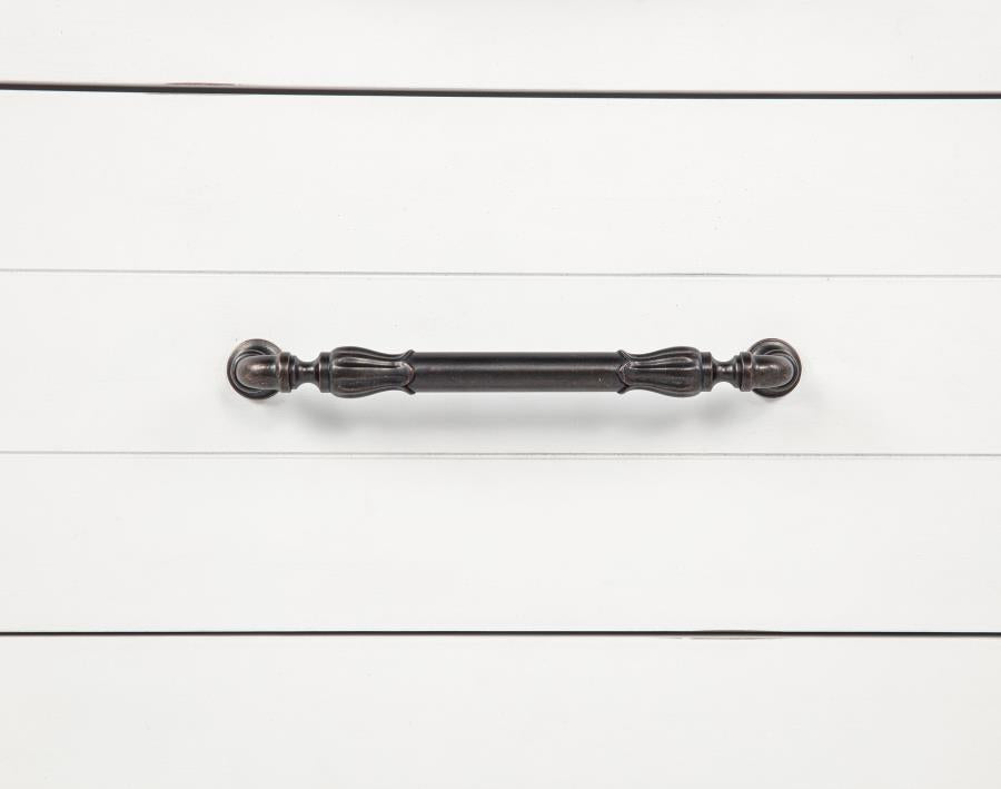 This five-drawer chest combines classic elegance with meticulous craftsmanship, radiating understated charm and enduring appeal. Its vintage white finish gently enhances the distinguished silhouette, complemented by molded edges and antique bronze ring pulls that enrich its character. Constructed from poplar, engineered wood, and veneer, it provides ample storage with smooth operation, making it a sophisticated and practical addition to any bedroom.