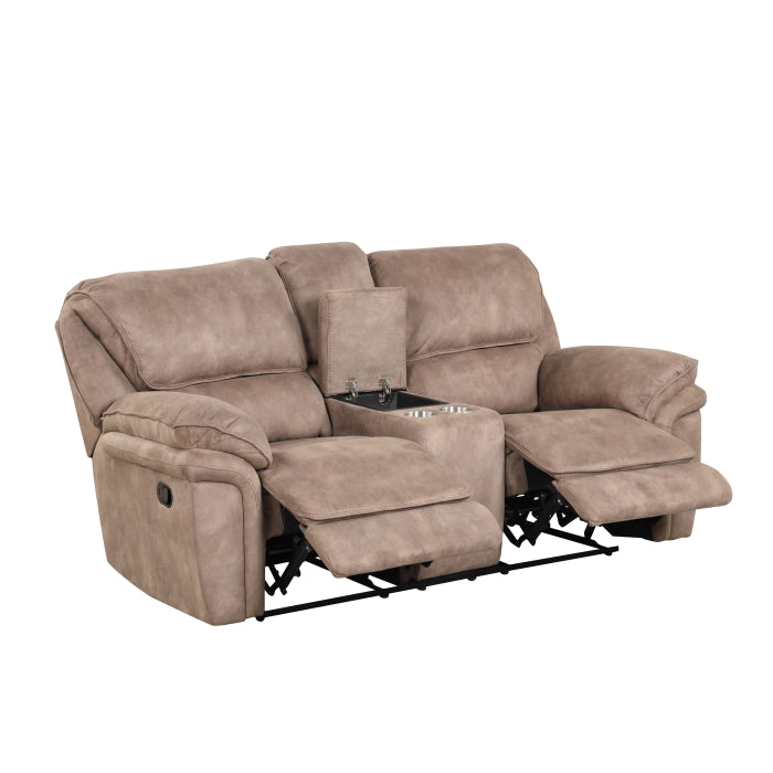 Sofá manual tapizado en tela marrón claro con bandeja desplegable, puerto USB y estación de carga con toma de corriente