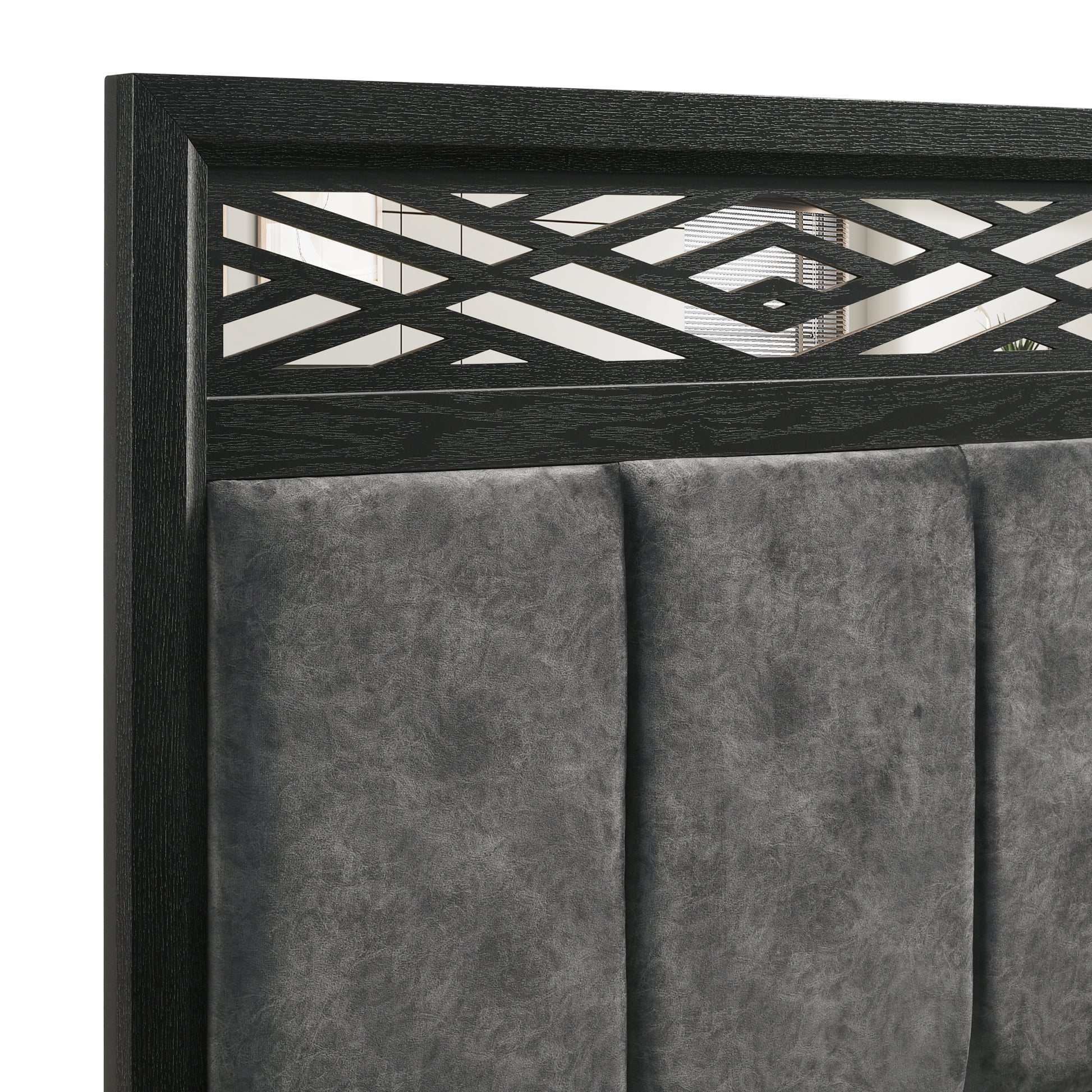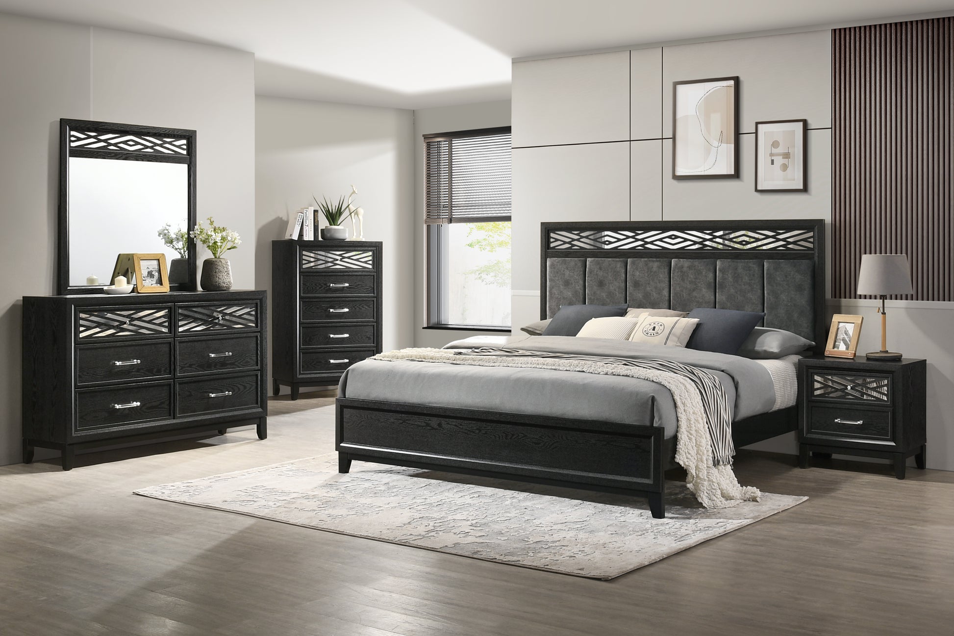 The Obsidian Collection brings contemporary elegance to your bedroom with its striking black finish and geometric mirror accents. Built from premium solid Rubberwood with refined veneers, this curated set combines form and function seamlessly. The collection features a commanding padded panel bed, spacious 6-drawer dresser, matching mirror, 5-drawer chest, and paired nightstands—each piece outfitted with smooth-gliding drawers and sophisticated acrylic hardware. Clean lines and bold design details create an undeniably luxurious atmosphere, while generous storage solutions keep your space organized and uncluttered. Whether you're redesigning your master suite or creating a personal retreat, the Obsidian Collection delivers the modern sophistication and practical elegance your bedroom deserves.