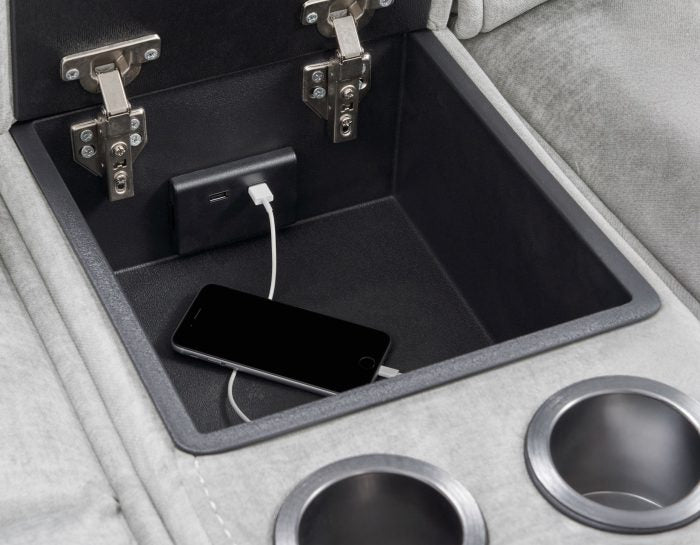- Functional Storage Console: Includes two stainless steel cupholders and a lift-top storage compartment with USB-A/C ports and electrical outlets for convenient charging and storage.