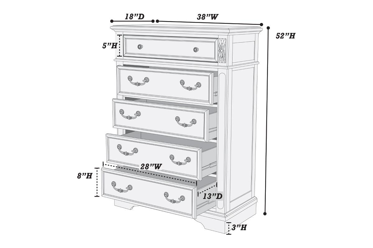 Cómoda de 5 cajones con acabado color crema (38" x 18" x 52"h)