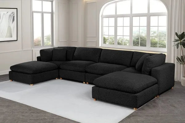 Transform your living space with this sophisticated modular sectional that adapts to your lifestyle. Wrapped in luxuriously soft boucle fabric available in elegant gray, black, or cream, it combines contemporary design with everyday comfort. The reversible, down-filled cushions invite you to sink in and unwind, while the modular configuration lets you customize your layout for any room. Solid wood legs ground the piece with natural warmth, making this sectional the perfect gathering spot for intimate moments or entertaining guests.