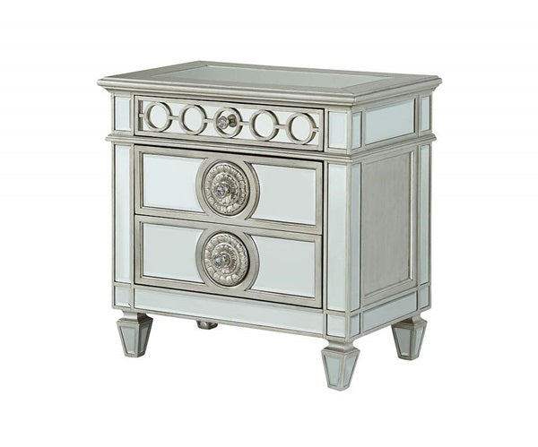 La mesita de noche Varian 26153 brinda una presencia audaz en cualquier habitación, con un diseño elegante con 4 patas cónicas y 2 cajones de almacenamiento con perillas de cristal. Visualmente mejorada con patrones geométricos en relieve y un acabado de espejo, esta pieza de moda se combinará sin esfuerzo con la decoración existente, elevando el espacio para volverlo sofisticado e interesante.
