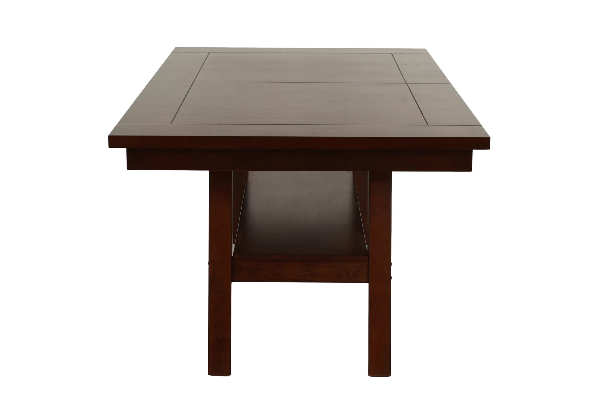 Featuring a strong design of bold lines and dark hues, this semi-formal dining table set by Poundex features chairs and tables of various heights and a bench covered in a dark walnut finish in solid wood birch veneer. The chair back supports have a "v" design making it a handsome piece for your home dining space.