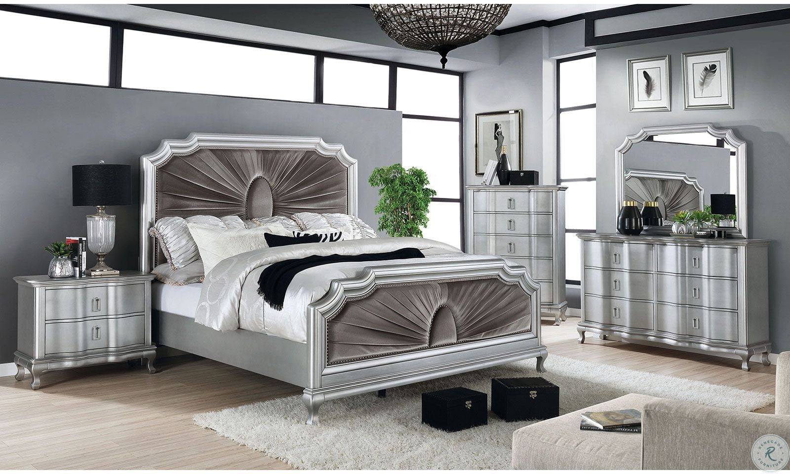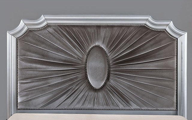 Achieve a stunning look with the Aalok Bedroom Collection, boasting a unique transitional design. Gray velvet head & footboards are complemented by pleated starburst designs, while shimmering silver-finished accompanying pieces feature convenient built-in USB outlets. Ample storage & a captivating design make for the ultimate modern bedroom sanctuary.