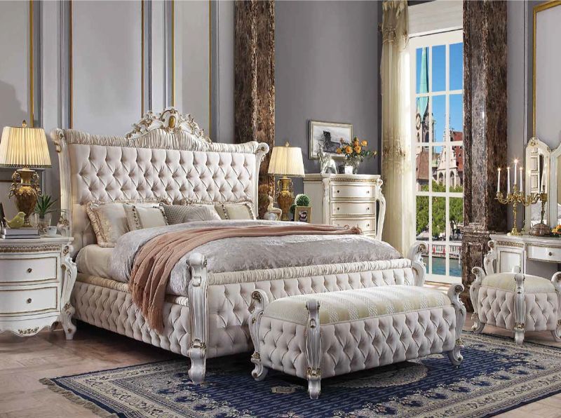 The exclusive Picardy bedroom collection by Acme Furniture brings the influence of European antiques to life with traditional carvings, detailed looping, along with a gorgeous antique pearl finish. The hand applied finish enhances the beauty of the detailed wood work & carvings. The bed features tufted upholstery. This elaborate collection will surely bring true splendor into your home.