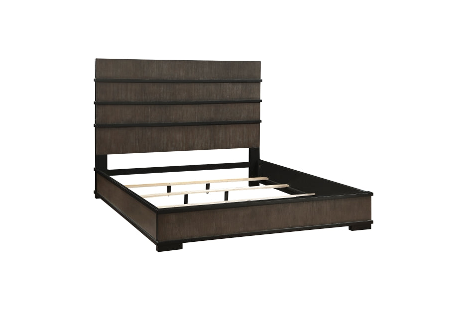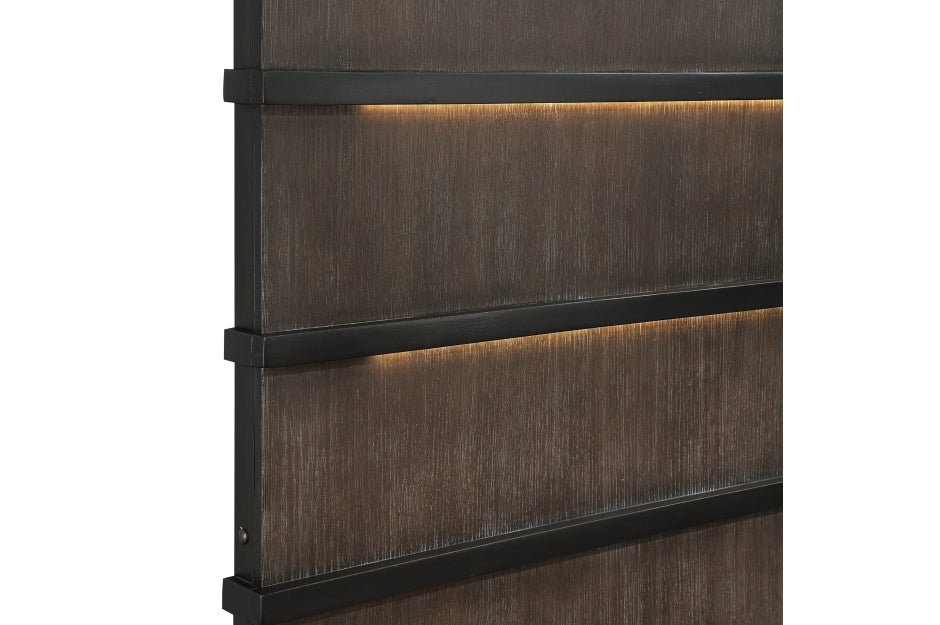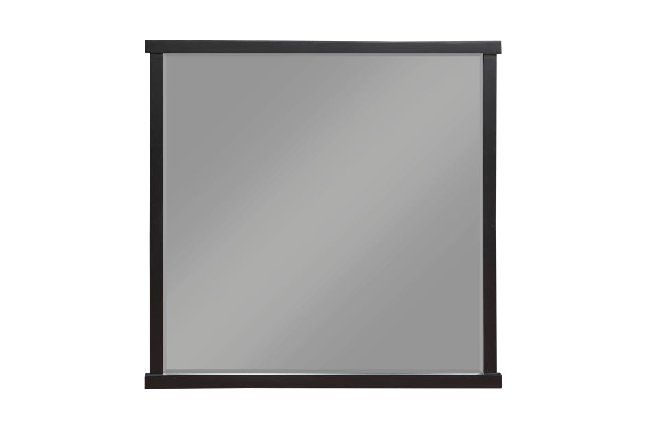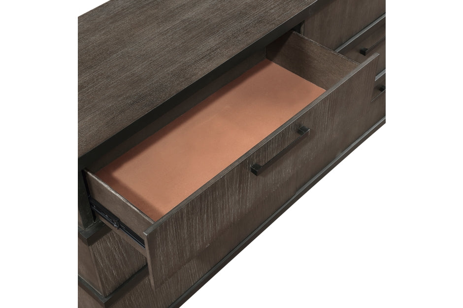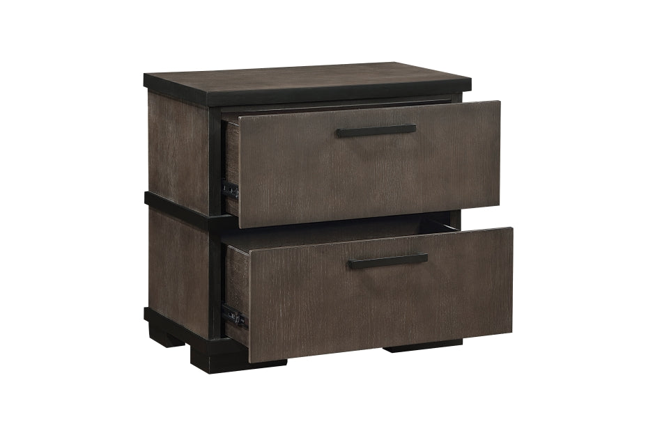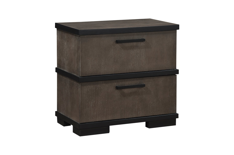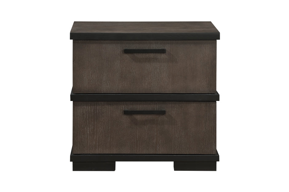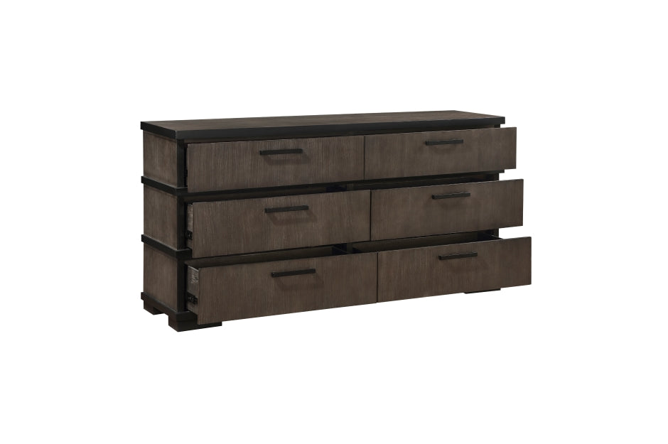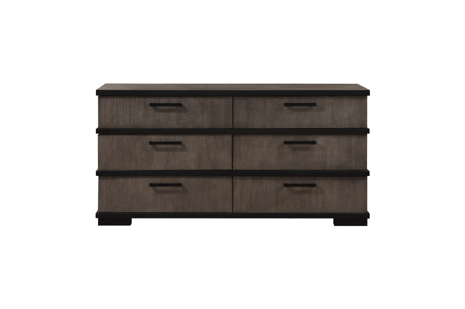 The Acworth Collection achieves a dynamic look with modern lines and a two-tone finish of brown-ish gray and black over oak veneer. Embracing a modern-industrial aesthetic, each case piece is adorned with black bar hardware that echoes the minimalistic lines of the bed, dresser, mirror, nightstand, and chest design. This collection's texture, hue, and design offer an informative and formal impression without the use of subjective language or exclamation points.