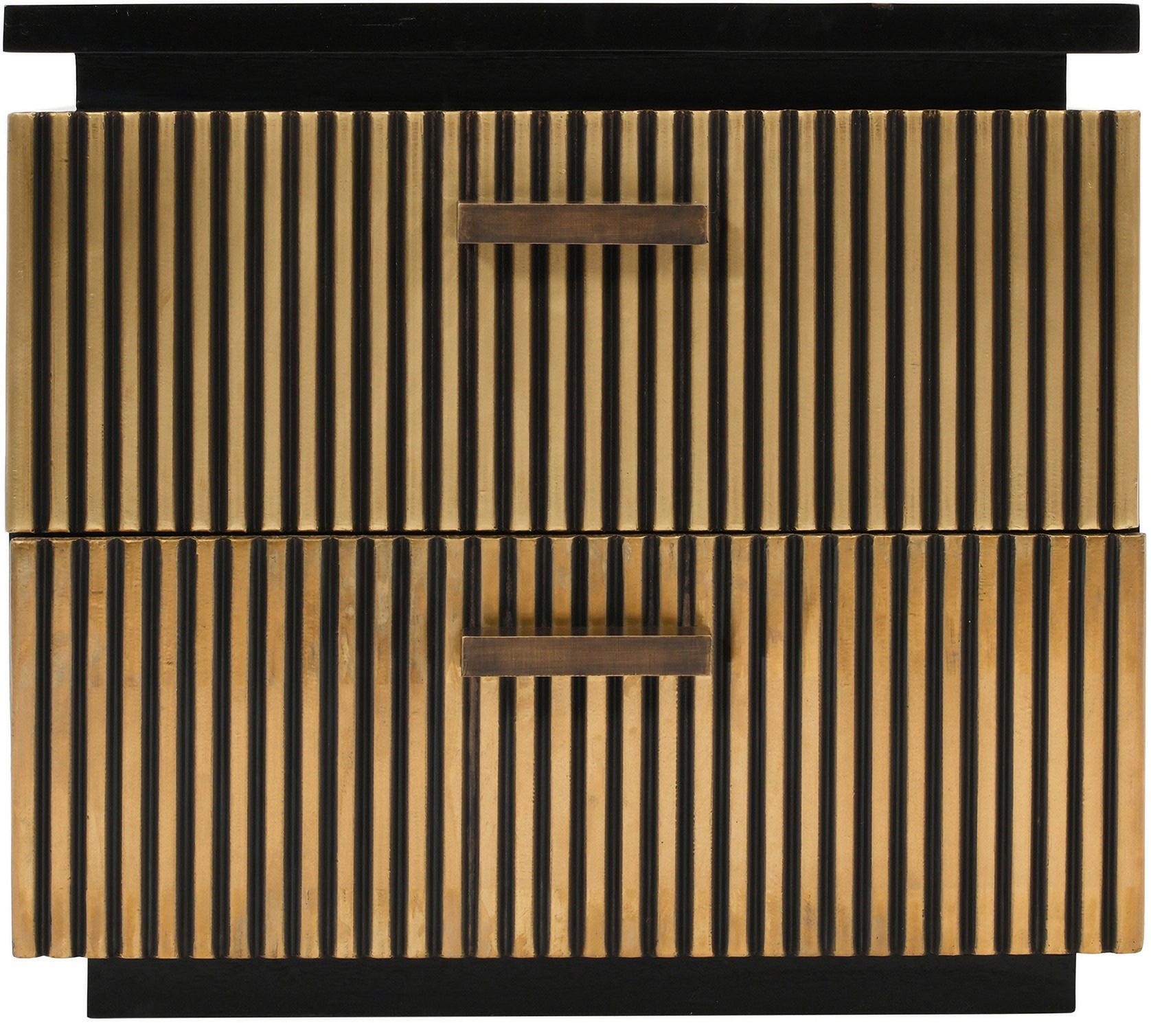 Sleek black nightstand with handcrafted brass metal accents. Constructed from solid mango wood, this two-drawer piece combines contemporary style with practical storage for bedside essentials. A sophisticated addition to any modern bedroom.