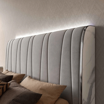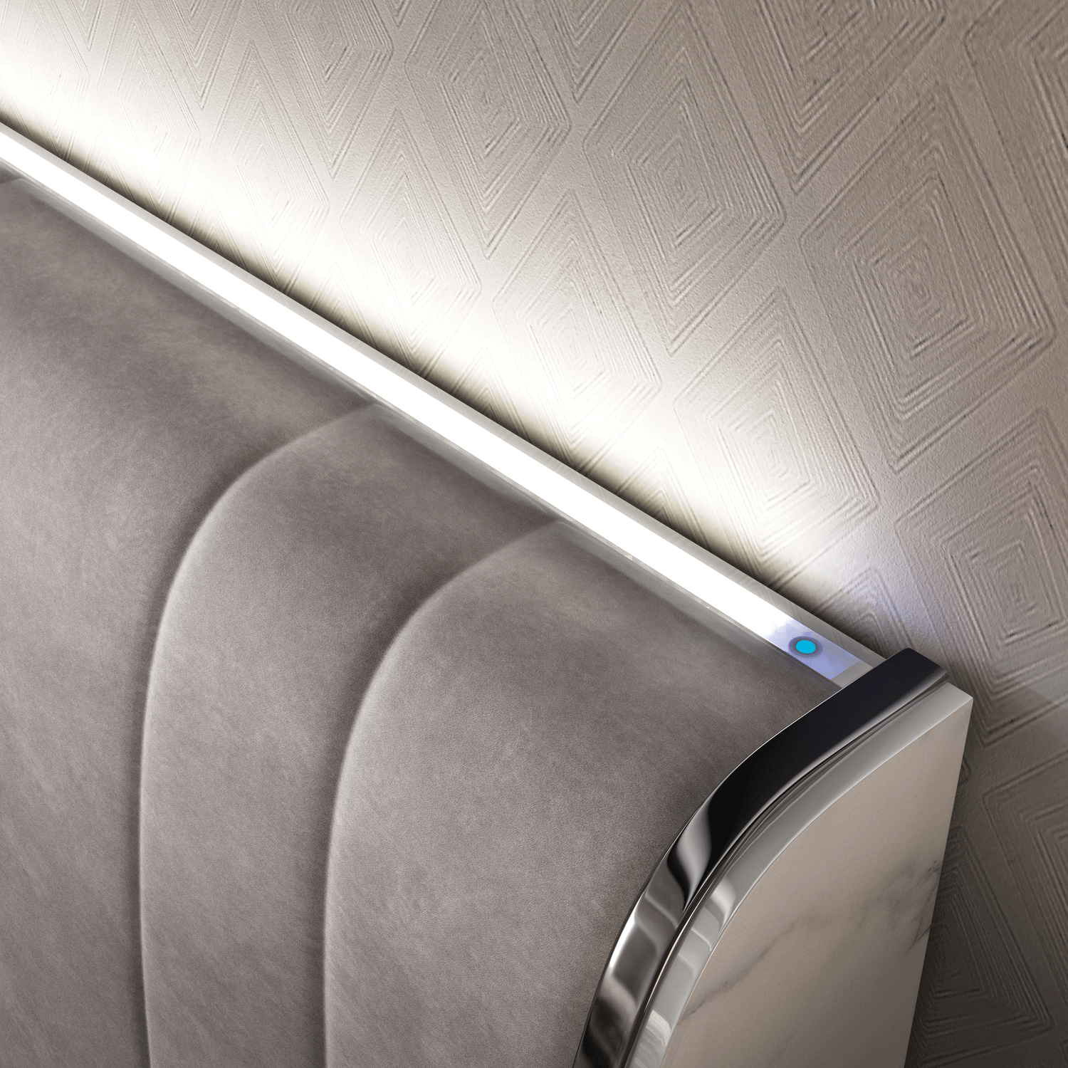 This innovative collection exudes a sense of harmony. The bed features a curved headboard and sleek lines for a truly elegant look. A built-in light adds a captivating touch and sets the perfect mood.