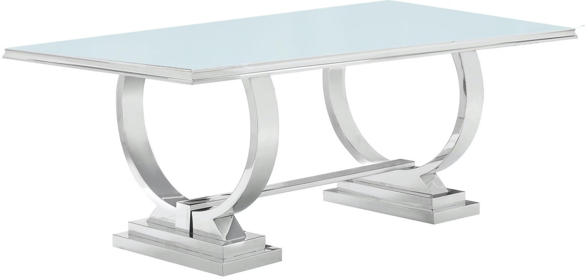 Create an opulent air of sophistication with this elegant dining table. A long & spacious tabletop seats 6 guests rather comfortably. Slide up a chair beneath it's opaque white tempered glass surface for formal dinners & casual gatherings. Supporting the tabletop is a trestle-inspired stainless steel base with ring-shaped end supports, all of which boast a gleaming chrome finish that reflects the dining room's color palette like a chic mirror. Available within this same collection are a delicate light pink & grey slipper style dining chairs, accenting the exquisite nature of the table even further.
