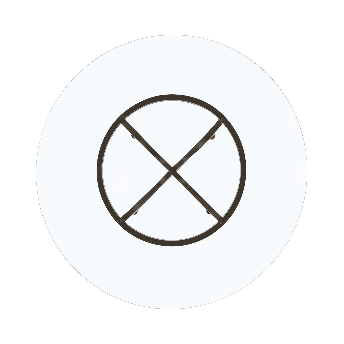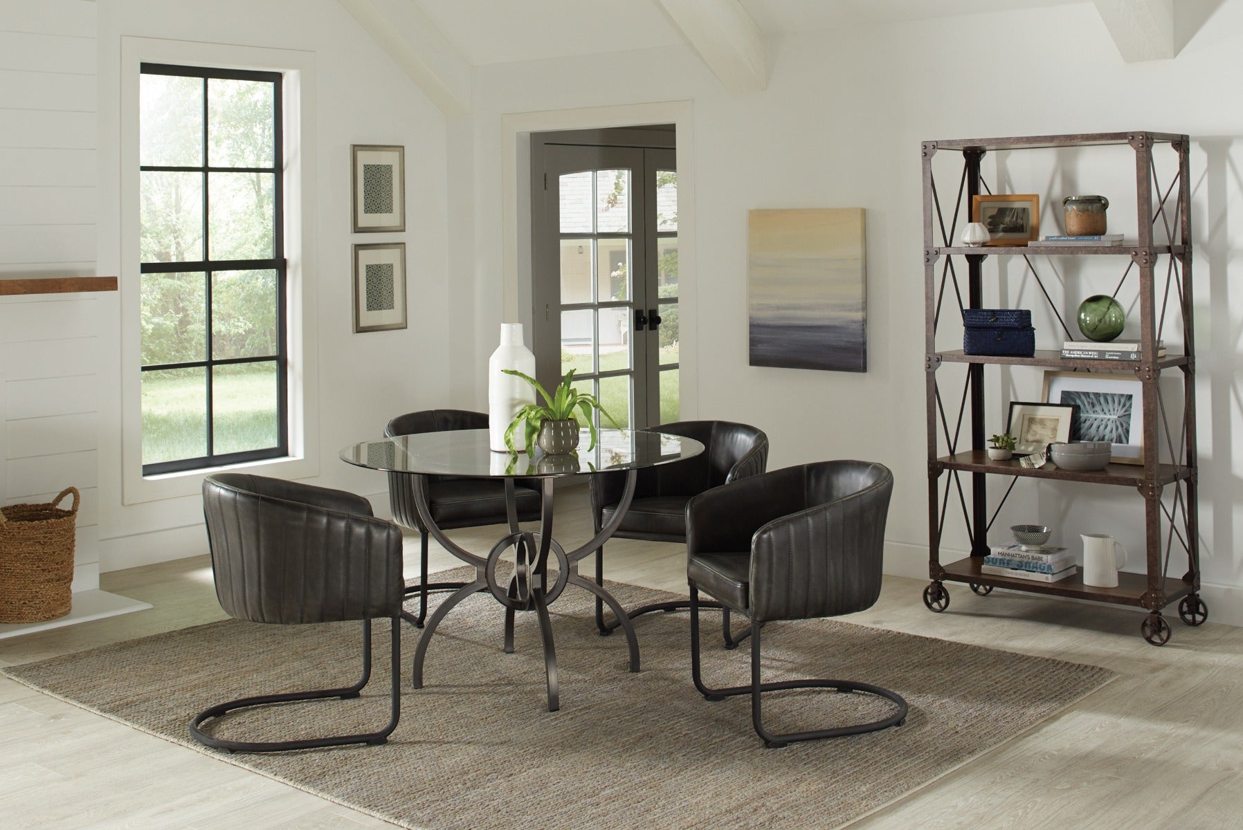 Celebrate eye-catching style in your dining room with this five-piece dining set from the Aviano collection. A round tempered glass tabletop makes the most of available space, while highlighting the sculptural appeal of the table base. The table base displays an exquisite design of curves meeting around center rings all in a rich gunmetal finish. Cushioned barrel shape chairs are plushly upholstered in supple anthracite leatherette for the ultimate comfortable dining experience. This set is the perfect space-saving solution for a casual contemporary dining room.