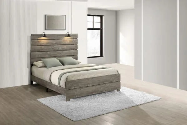 This bedroom set features a rustic design with antique gray wood paneling. The bed comes in King, Queen, and Full sizes and offers two headboard lamps. Nightstands include integrated USB chargers on the rear for convenient device charging. Assembly is straightforward, and a box spring is necessary for the bed.