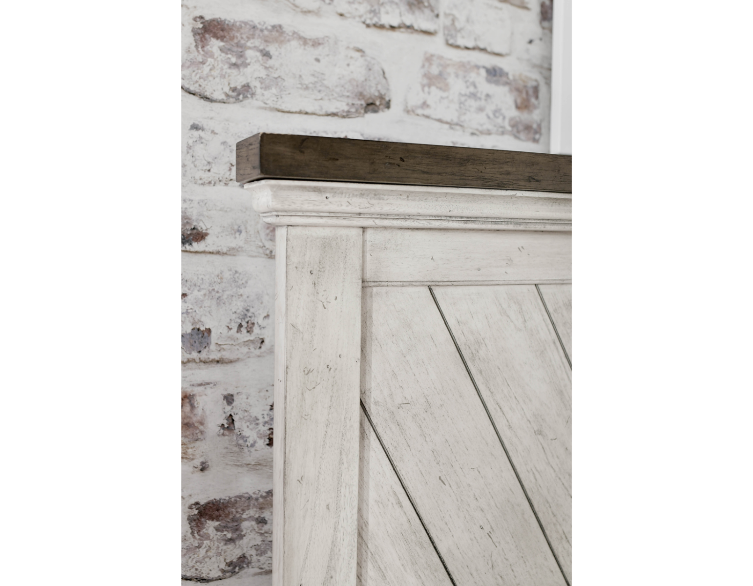 A rustic, farmhouse-inspired bedroom, Bear Creek features a sable finish that contrasts beautifully with caramel stained tops and cap rails. The chevron patterned headboard and footboard is offered in King and Queen sizes and the bedroom collection offers a variety of storage items with ultra-deep drawers supported by side drawer glides for easy operation.