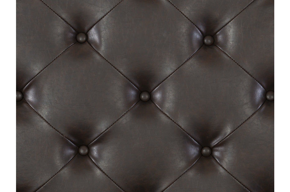 This Beddington Collection by Homelegance has a classic profile combining demure accents & luxurious highlights for a timeless style in your bedroom. The traditional case pieces & bed have stylish moulding, bun feet, & picture frame drawer fronts to define their bow-fronted shapes. The grandly designed bed has a tufted faux leather headboard set in a stately carved frame. An exquisite blend of primavera & ash burl veneer is finished with a dark cherry, enhancing the wood's grains' beauty. Each drawer is highlighted by a mix of metal & faux crystal knobs. The nightstand has a top drawer with integrated USB & power ports for easy charging.