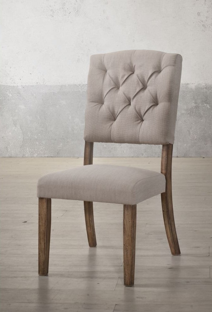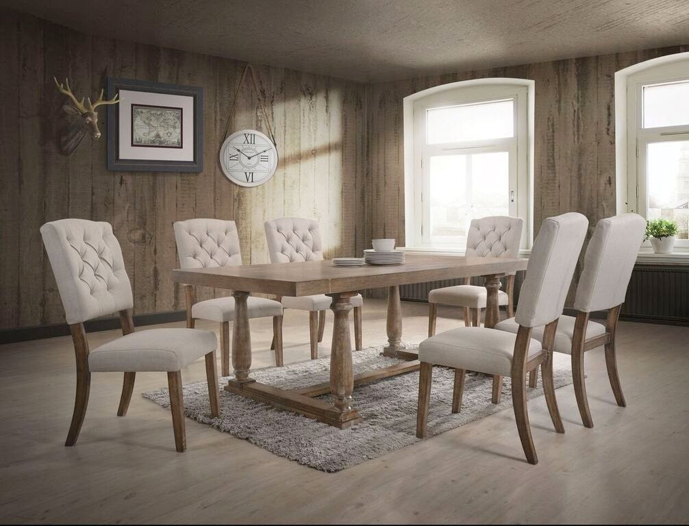 This collection presents a remarkable look for your dining room, a rectangular trestle table with turned legs and double molding edges in a weathered Oak finish. Complementary side chairs boast ornamental button tufted backs and cushioned seats, ensured with reliable solid wooden legs. You can confidently share meals with your friends or family, assured of this collection's fashion & strength.