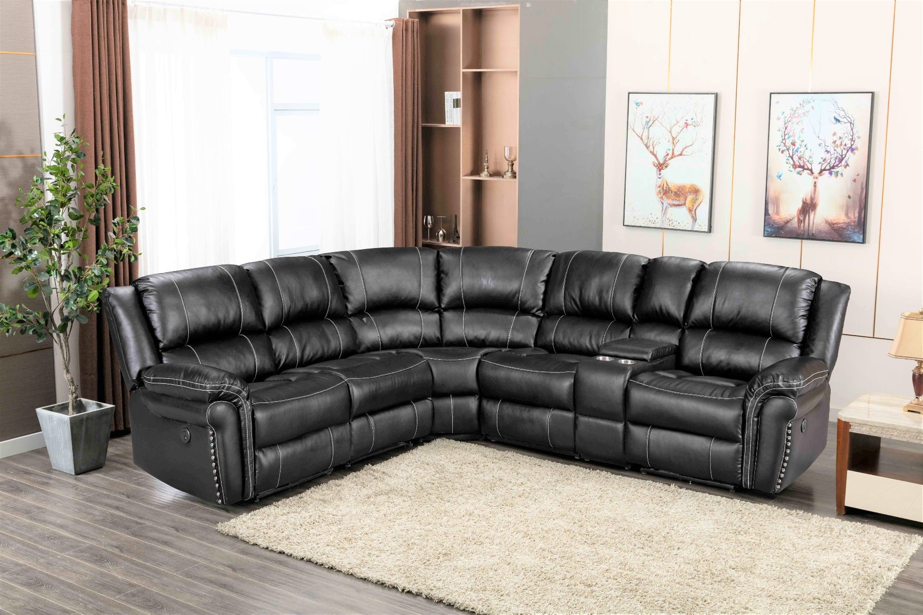 PU Faux Leather Sectional Sofa (Reversible) with 2 USB & Power Recliners, 1 Manual Recliner, & Storage Console with Stainless Steel Cup Holders.