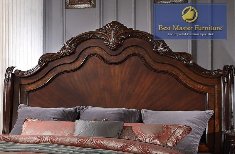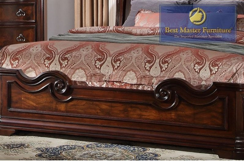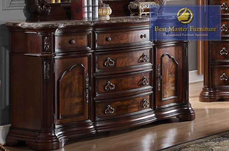 Create a sophisticated environment in any master bedroom, the collection features marble top, antique hardware, this beautiful bedroom set is coated in a warm walnut color.