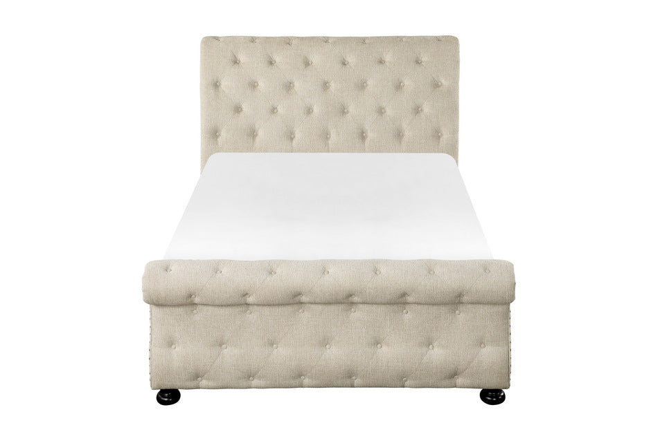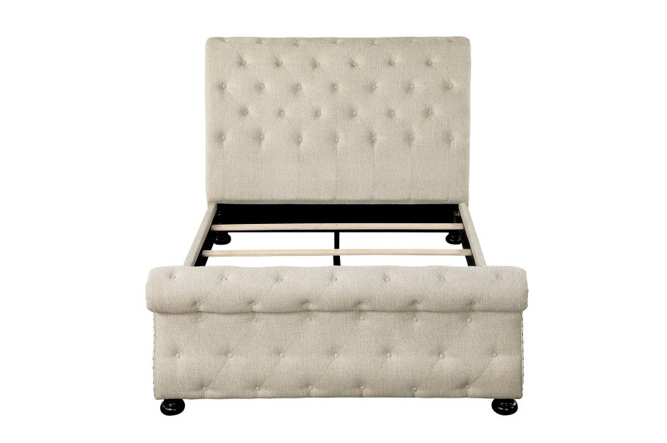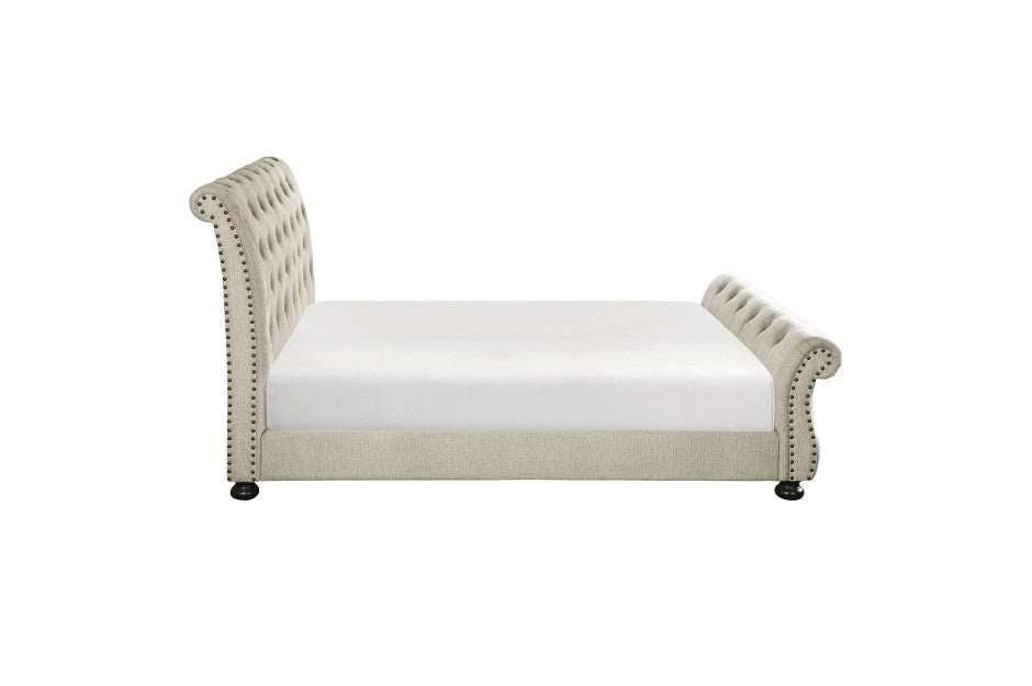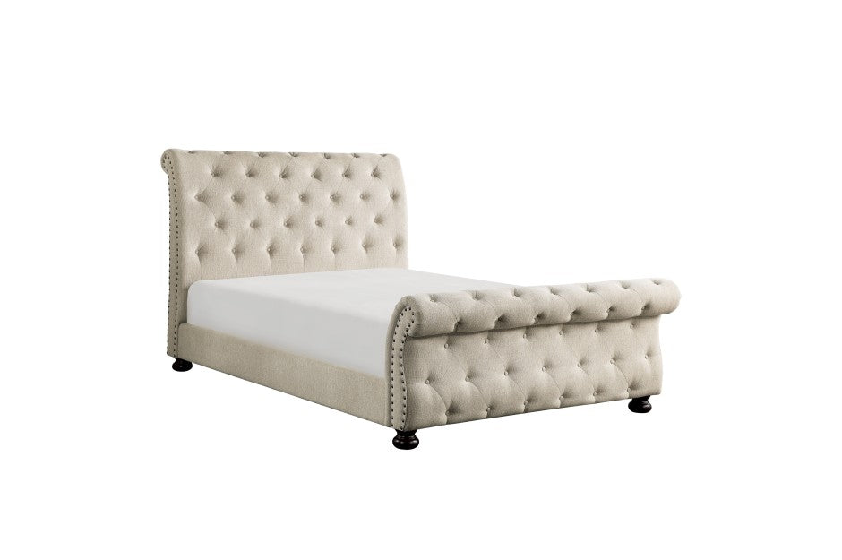 The traditional styling of the Crofton Collection by Homelegance serves as a classic addition to your home’s décor. The beige covering of this fully upholstered sleigh bed is accented with button tufting, nailhead accent & rolled profile, creating a neutral canvas for your decorative inclinations.