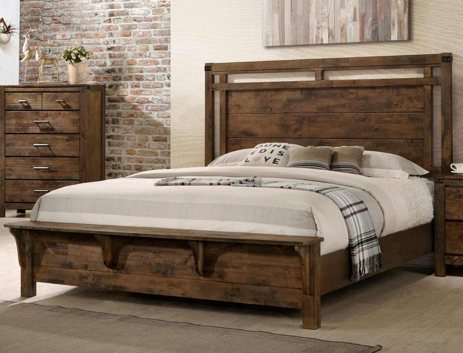 Indulge in the cozy appeal of this captivating bedroom collection that embodies the essence of a peaceful getaway. The strong bed, featuring a solid frame and a weathered wood finish, evokes the inviting charm of a rustic cabin. Accompanying the bed are coordinating pieces: a spacious dresser with an elegantly framed mirror, a tall chest, and a nightstand, all showcasing a robust build with a classic touch. The smooth metal handles on each drawer add a subtle industrial touch, complementing the natural grain of the wood.