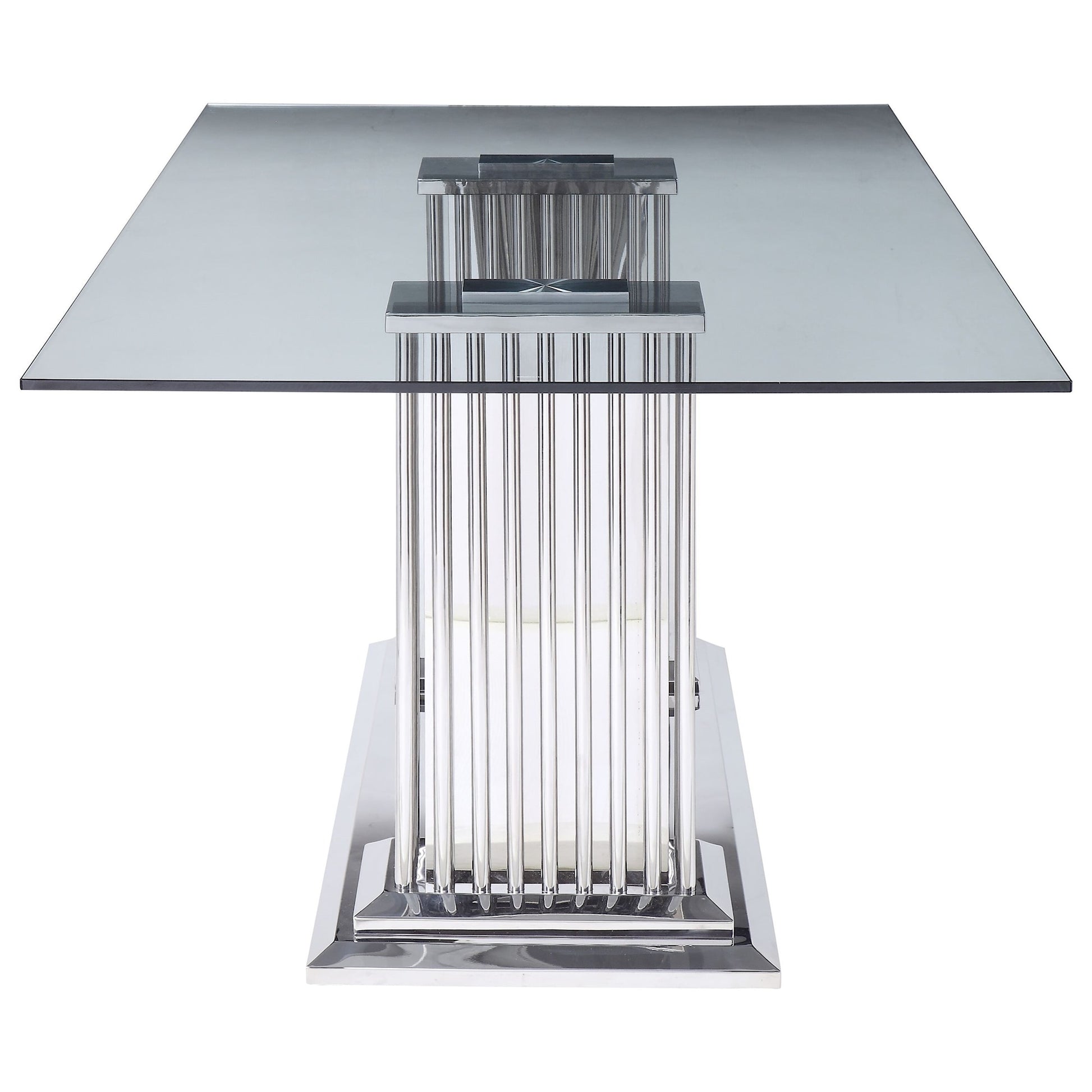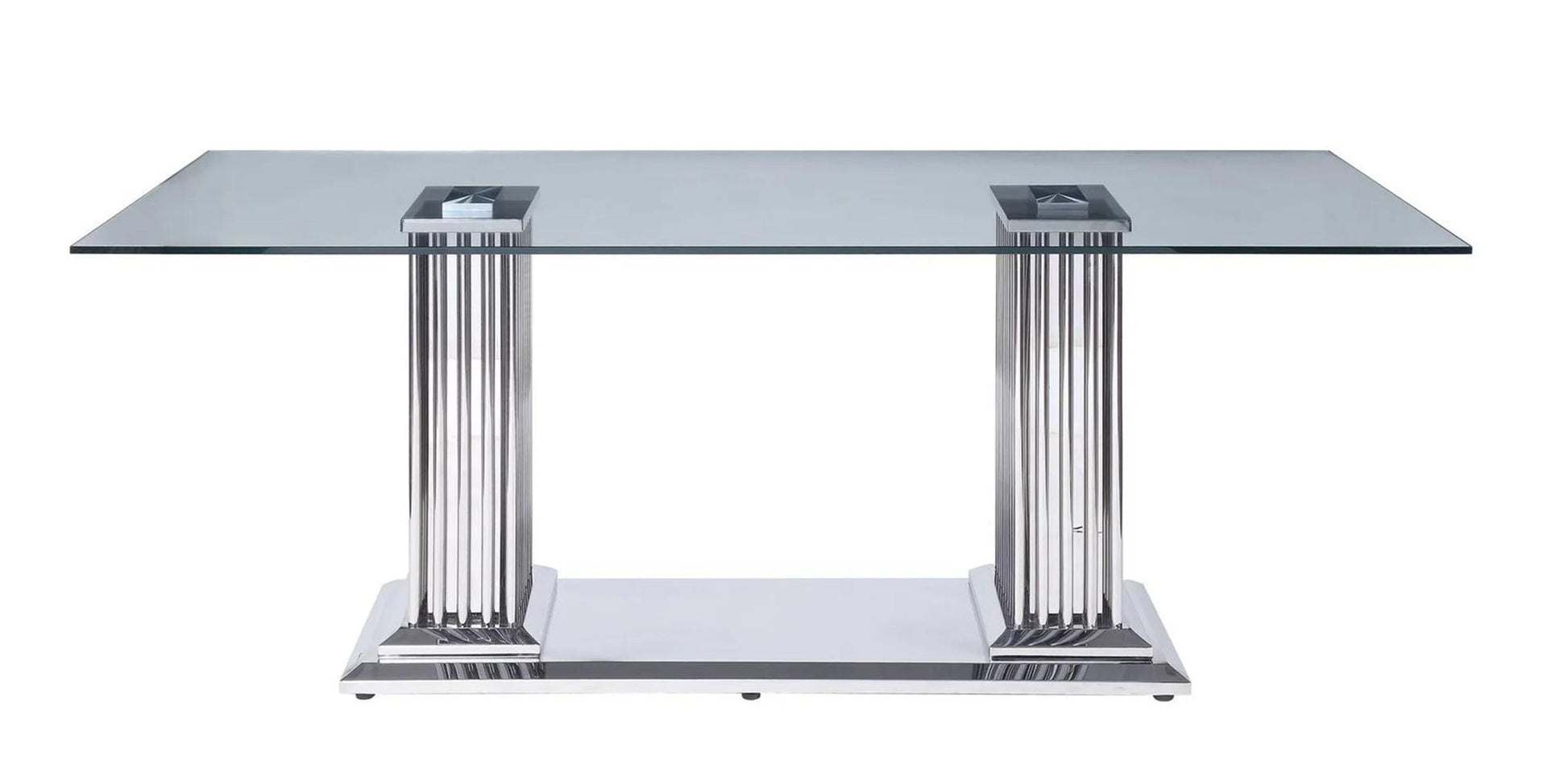 Add a modern touch to your dining area with the Cyrene dining group. With a pair of stunning mirrored pillars serving as the table base, this gorgeous pedestal table doubles as a piece of art in your dining room. It's spacious beveled glass top reveals the double pedestal base & gives an open & refined feeling Dine like a rock star!