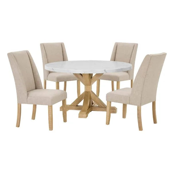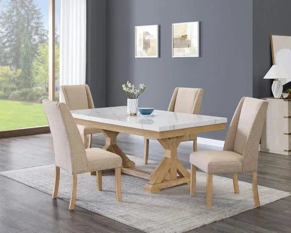 A modern take on classic design, enhance your dining space with our D521 dining set, featuring a white faux marble tabletop and sleek beige linen upholstered side chairs with button tufted bench. Each piece comes equipped with floor levelers to help prevent wobble, making this set not only stylish but also functional.