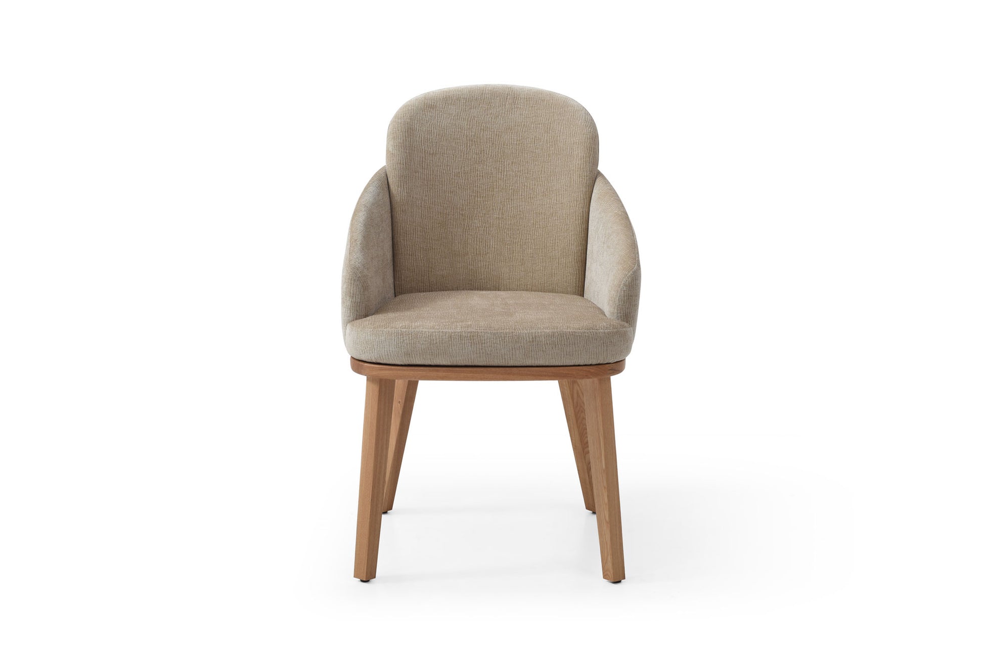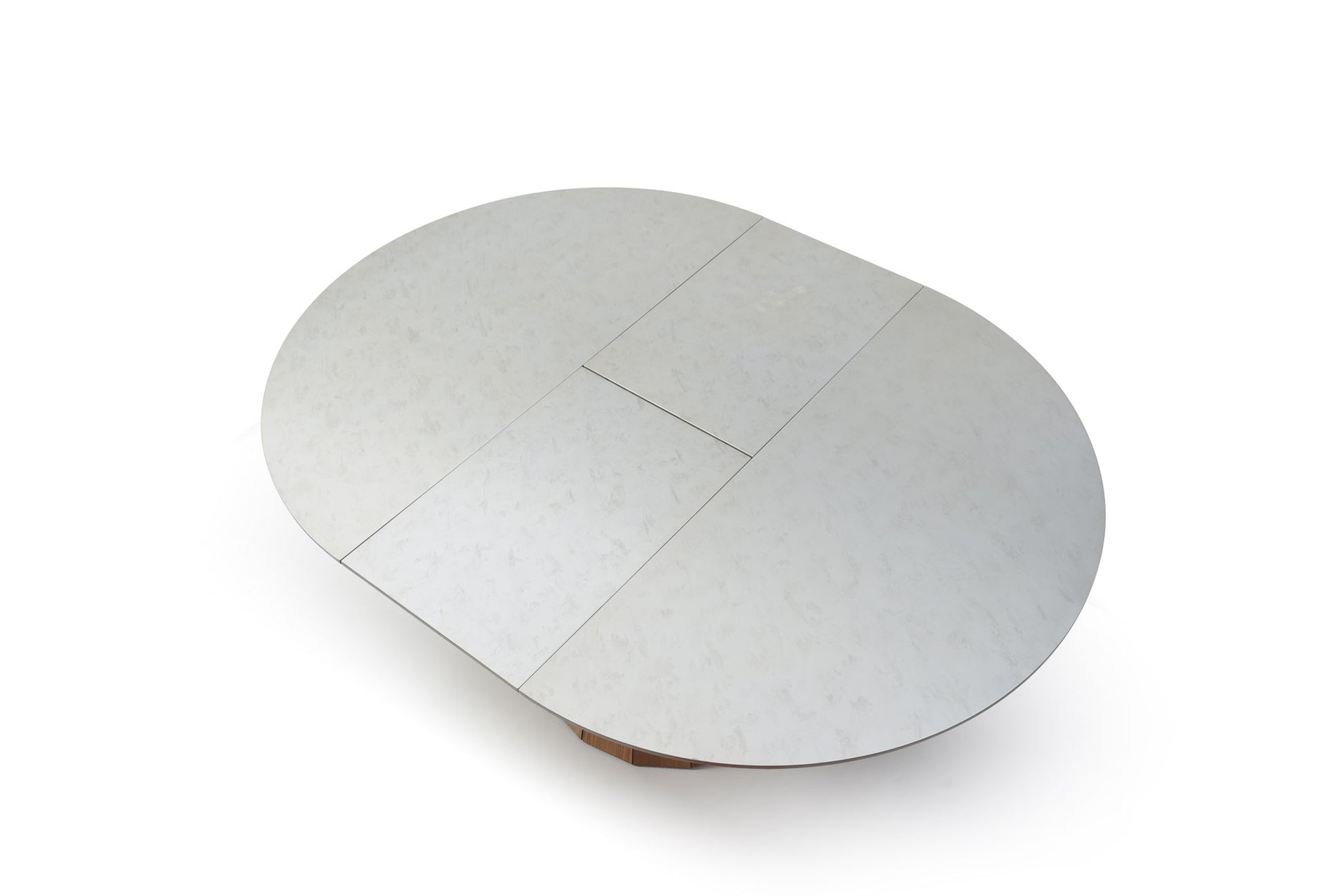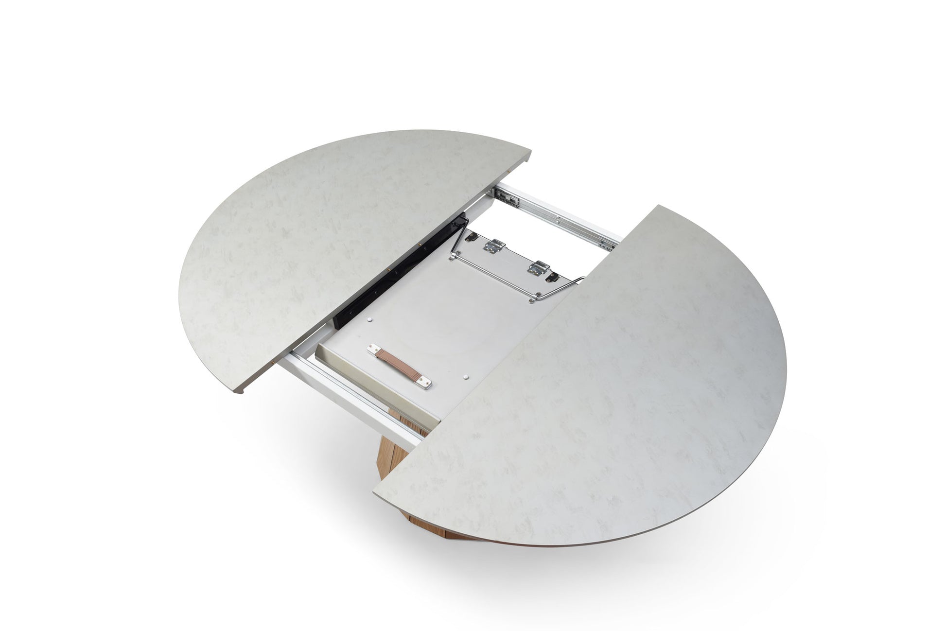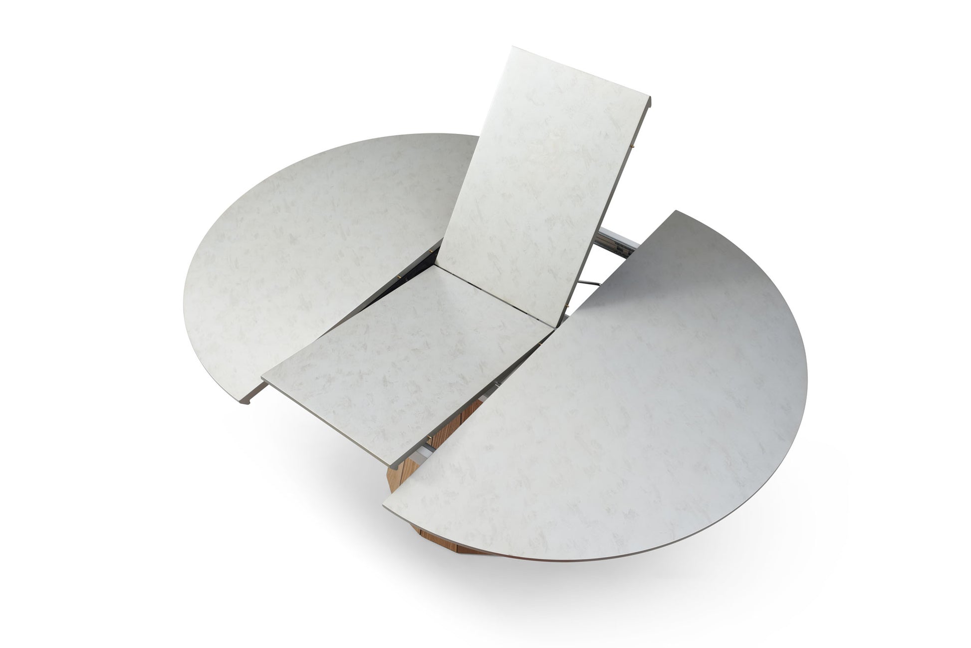Transform your dining area with the chic and contemporary 9493 Table and 1449 Chairs. Boasting a sleek round shape and a central pedestal base, this table is a stylish and practical addition to any space. The smooth tabletop extends smoothly, offering extra room for gatherings. The neutral tabletop perfectly complements the natural wood tones of the base, resulting in a cohesive and modern appearance that effortlessly blends with any current decor. Designed for both comfort and sophistication, the 1449 Chairs are upholstered in a gentle beige fabric and feature cushioned backs and seats for a comfortable seating experience.