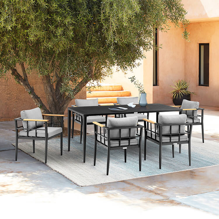 Enhance any outdoor space with the Ezra Outdoor 7-Piece Dining Set. Includes 6 chairs, 1 table. Chairs feature a modern silhouette with teak accents & geometric barrel back. Strong and durable, teak can last decades with no maintenance. Removable cushions, zipper closure for easy clean up. Aluminum frame, multi-layer powder coating for effective protection. Slat style tabletop, umbrella hole. Treated to last against UV, water, & outdoor elements. Black frame, natural teak & dark grey cushions. Chairs support up to 308lbs, 18" seat height.