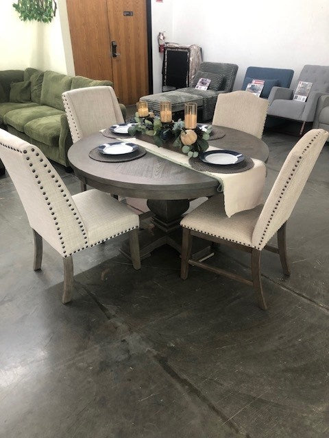Expertly designed for all occasions, this Dining Table features a round shape that is ideal for gatherings of all sizes. Its sleek design and stand-alone pedestal make it a space-saving piece that adds a touch of sophistication to any dining area. Versatile enough to be placed in a kitchen nook or formal dining room, it effortlessly complements any decor. To complete your dining set, add the matching chairs, available for purchase separately.