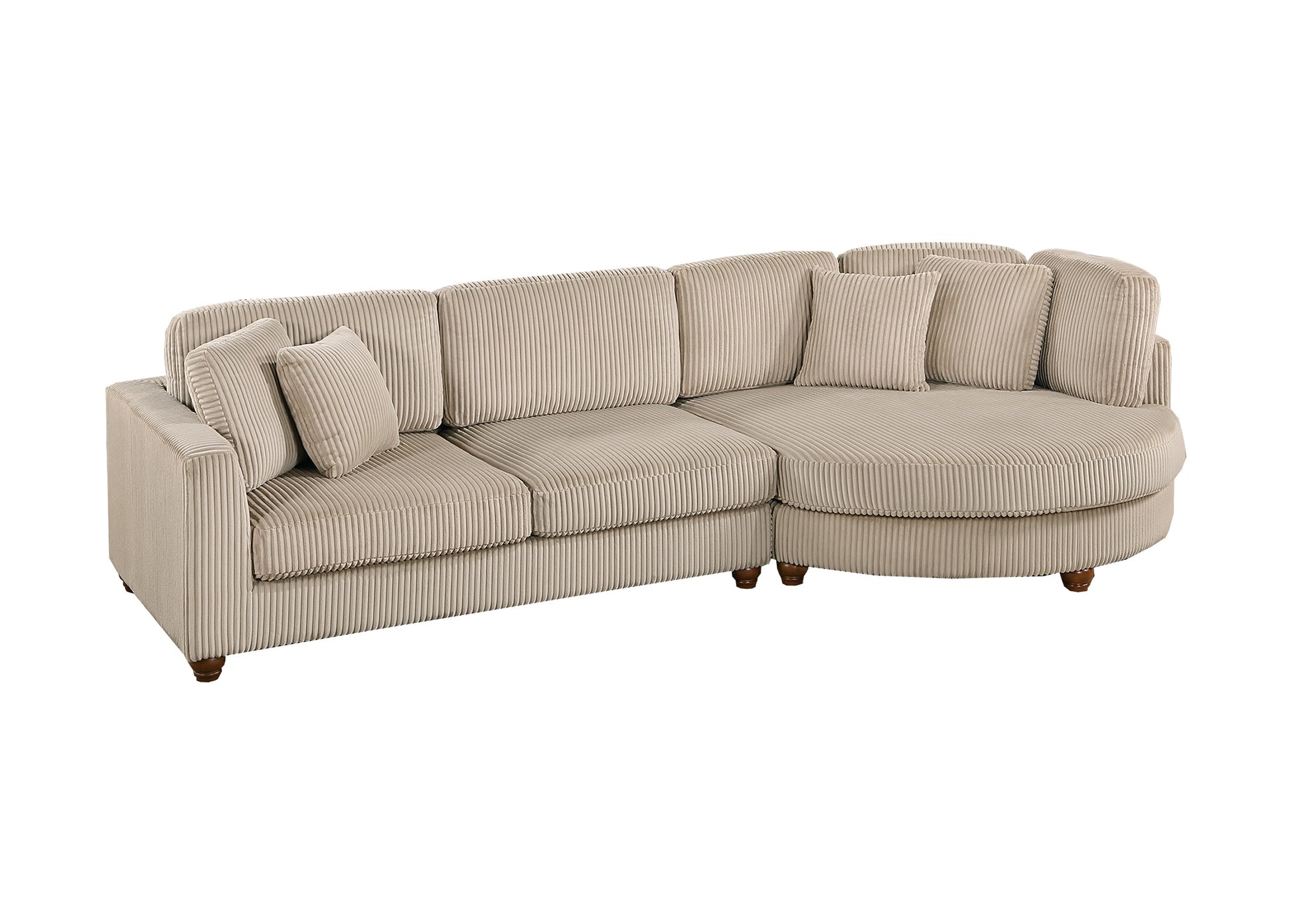 Create a haven of comfort and style in your home with this 2-Piece Sectional Set. Consisting of a Right Arm Facing (RAF) Chaise and a Left Arm Facing (LAF) Sofa, complemented by four plush accent pillows, this set is the perfect addition to any living space. The unique round shape of the RAF Chaise adds a modern touch to your décor, while the LAF Sofa offers versatile seating for all your gatherings. Supported by low-profile round legs, this sectional exudes sophistication while ensuring comfort. The sumptuous corduroy material provides a soft touch that invites relaxation after a long day, making it the perfect place to curl up with a good book or host a movie night with friends and family.