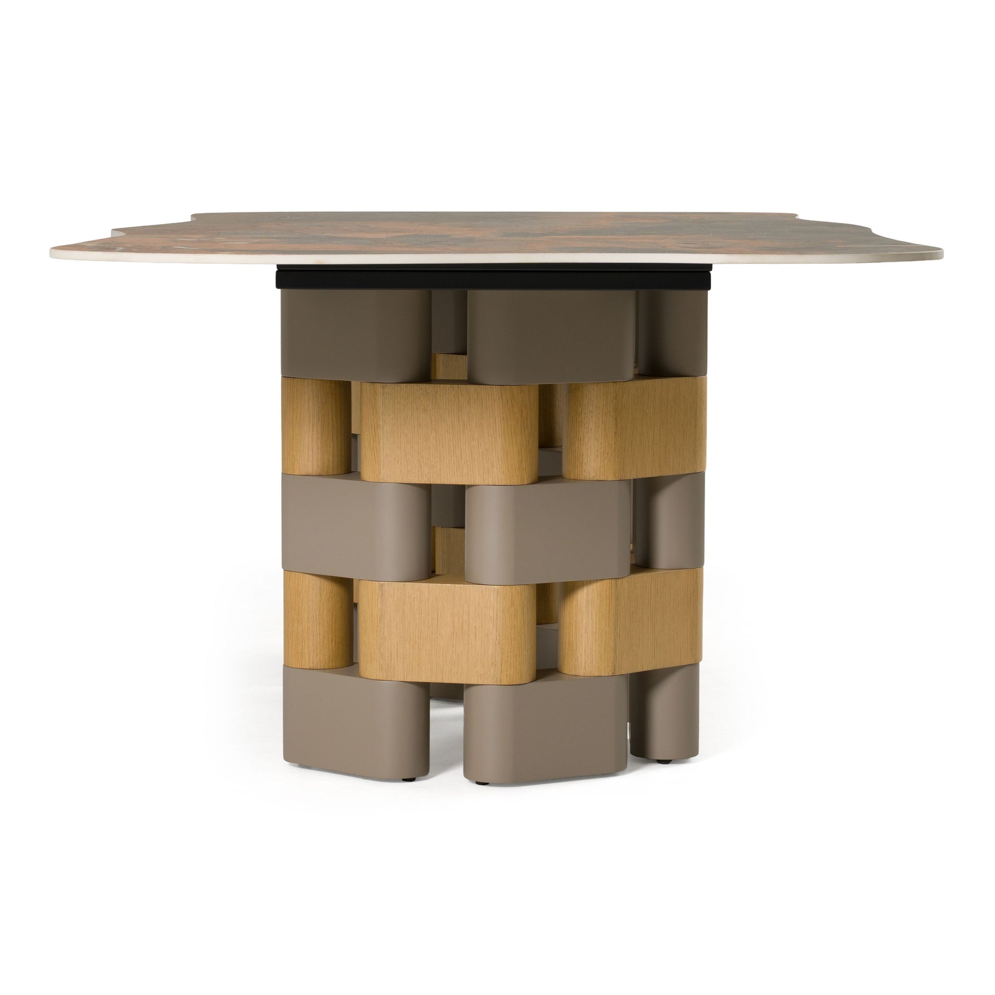 The Falzone dining table is where modern design meets timeless appeal. Featuring a striking combination of deep ceramic tones and warm natural oak veneer, this table commands attention with its gracefully curved form that brings movement and character to your dining room. Supported by a sturdy pedestal base, it accommodates everything from intimate dinners to larger celebrations with ease. The sophisticated matte finish adds refinement without pretension, making this an investment piece that transforms ordinary meals into extraordinary moments worth savoring.