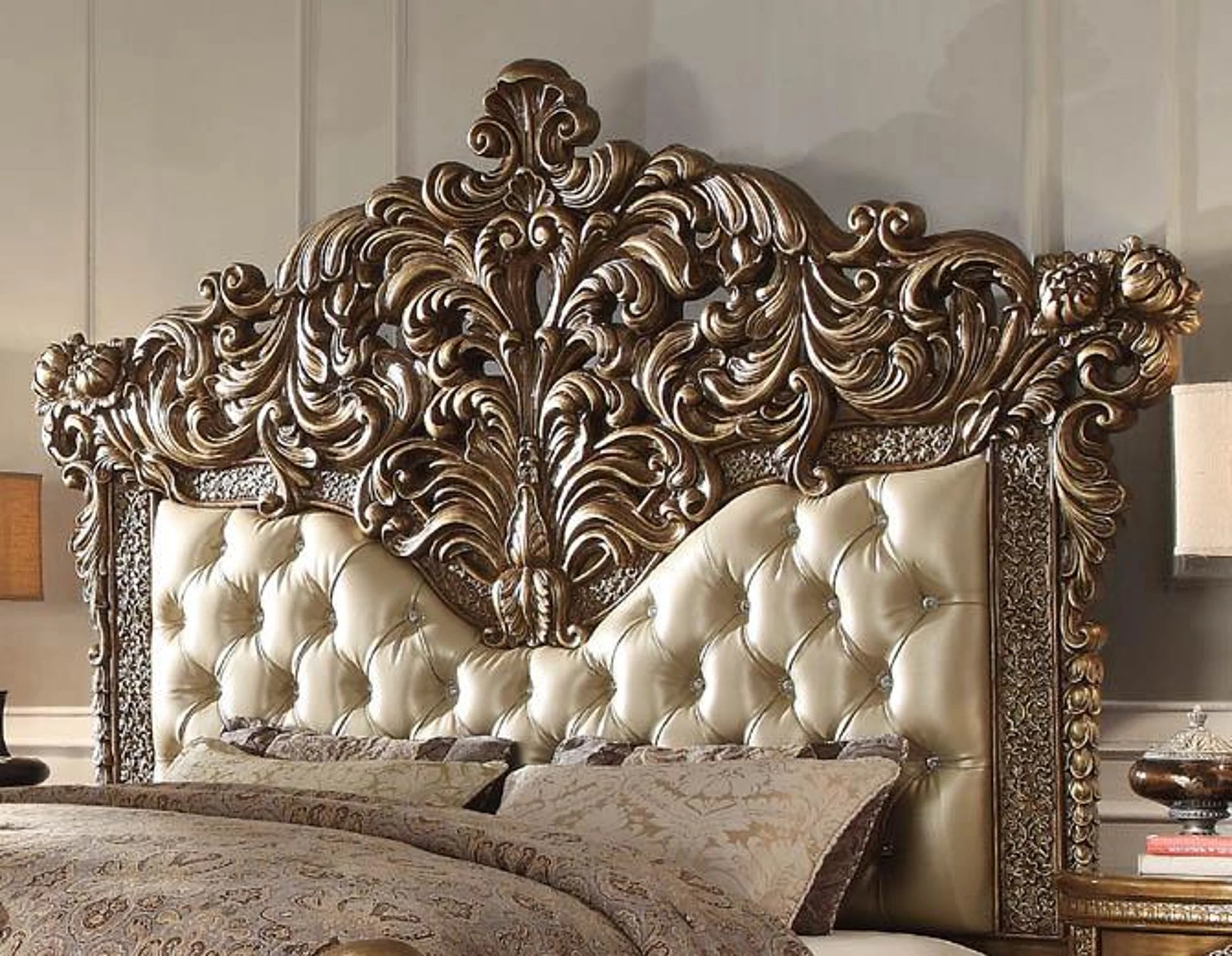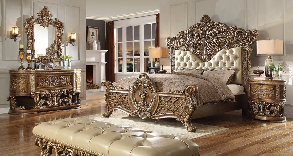 Abandon all the conventional designs for furnishing your master bedroom when you add a royal touch to it with the Farouk Carved Bed by Homey Design. The grandly-scaled bed of this ensemble recreates the charm of the bygone era by depicting many traditional designs & carvings in the framework. The high headboard is designed using an attractive fusion of elaborate carvings & a tufted upholstered panel. The dresser with mirror, bench & nightstands also echo the similar styling and all items are wrapped in a gold-hued finish to create an eye-pleasing impact.
