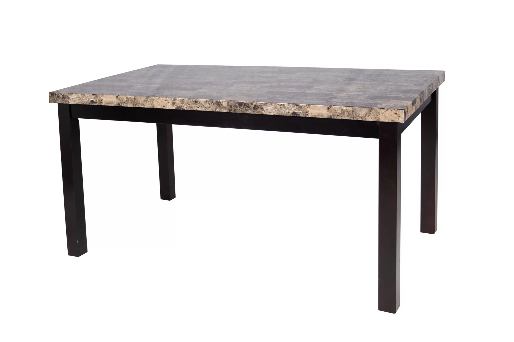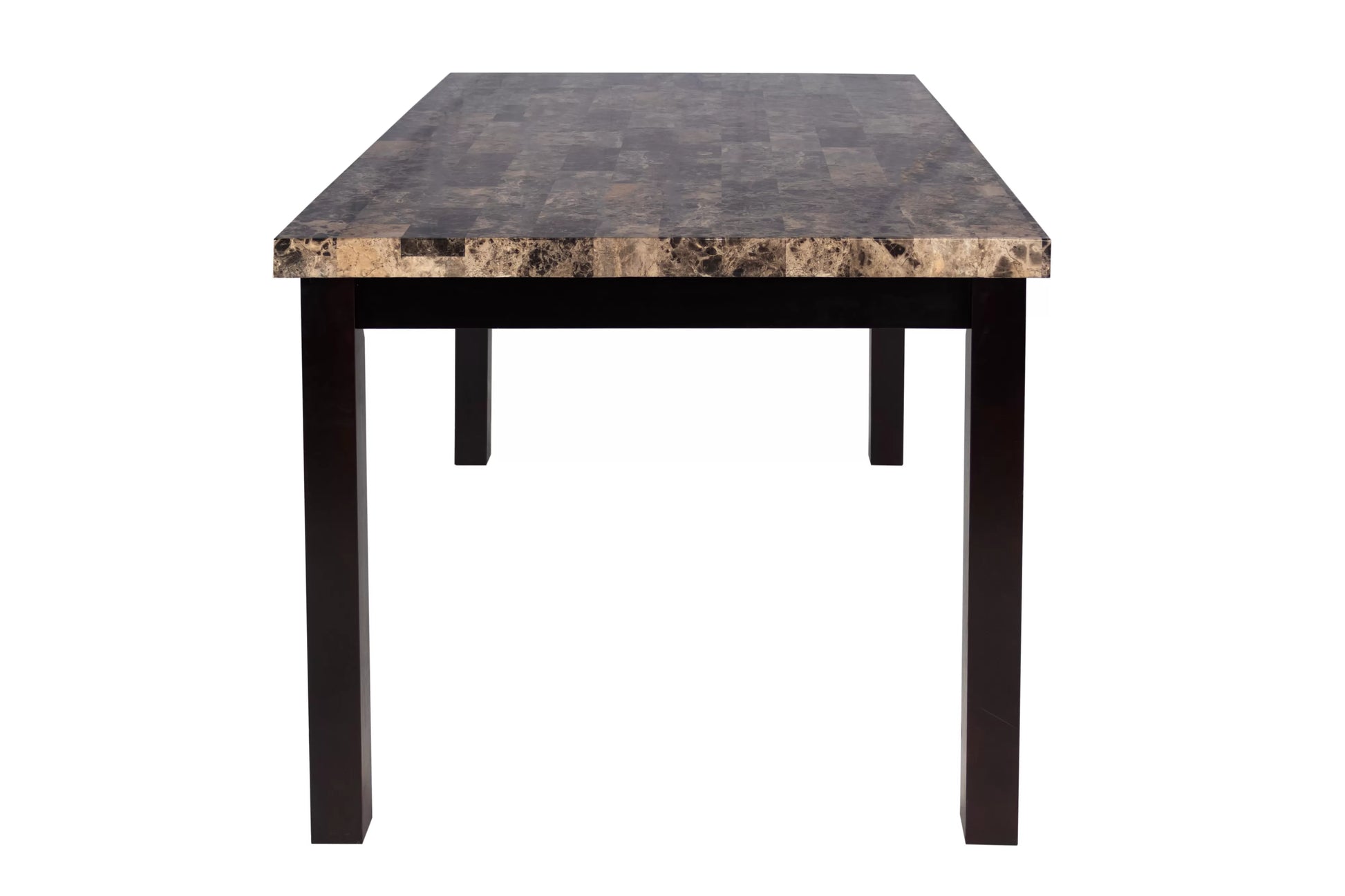 The lap of luxury is delivered with this marble-look or two-toned finished tabletop dining room table by Poundex. It includes seating for six & a bold frame in dark brown.