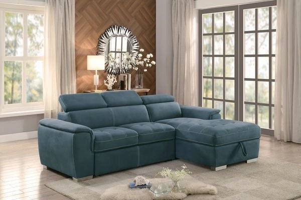 Providing the flexible option for relaxation, sleep plus storage, the Ferriday Living Room Collection will be a stylish & functional addition to your living room. Under seat storage is revealed with the pull of a tab on the end chaise. The lower portion of the seating configuration pulls out to reveal a pop up trundle that creates a bed space creating a relaxing environment with minimal effort. The collection is offered in blue or taupe fabric, both with contrast stitching.