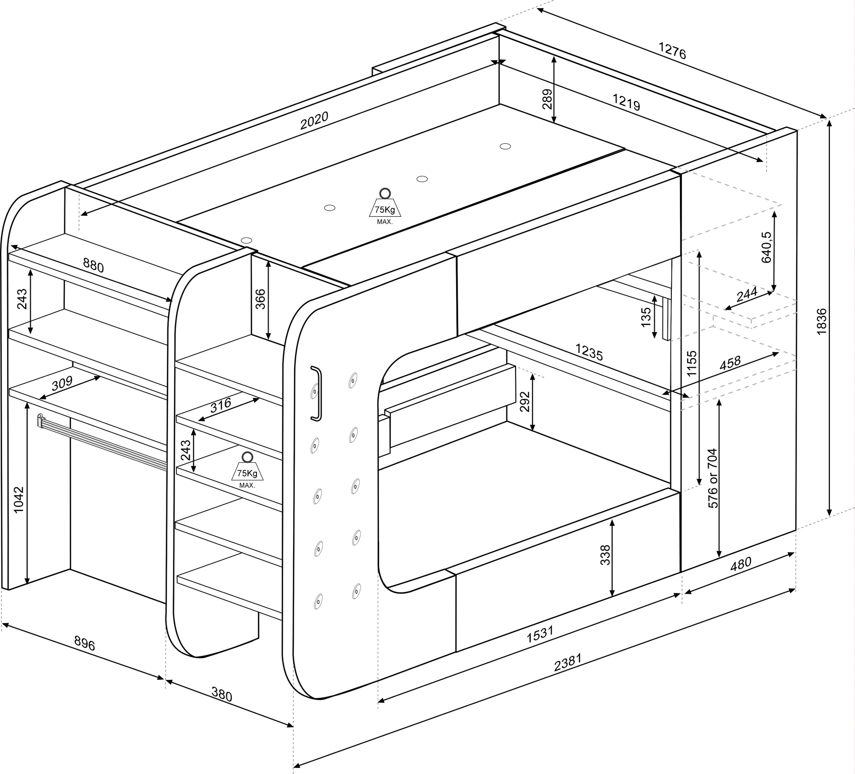**Height of the bed 6 feet , minimum ceiling height 9 feet.