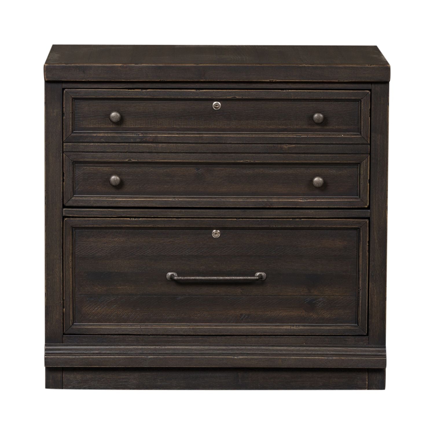 Enhance your workspace with a touch of elegance and comfort by adding the Harvest Home lateral file cabinet. Constructed with durable rubberwood solids and knotty white oak veneers, this cabinet boasts a charming chalkboard finish with saw cut hewing, a sturdy planked top and side panels, a bluff cut top drawer, and antique pewter bar pull and knob hardware. With full extension drawer glides and two locking file drawers, this cabinet offers easy access to your storage needs. Plus, bottom case dust proofing ensures the safety of your valuable documents. With its unmatched style and functionality, the Harvest Home lateral file cabinet is a must-have for your office. Complete the look by pairing it with the Harvest Home lateral file hutch.