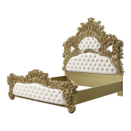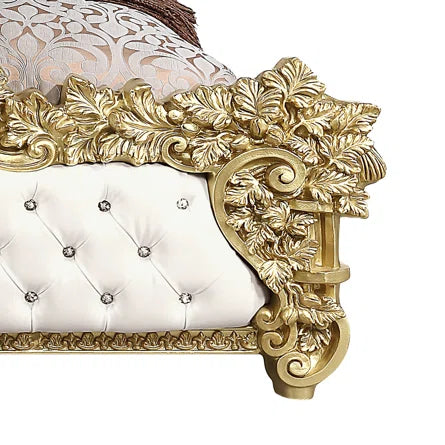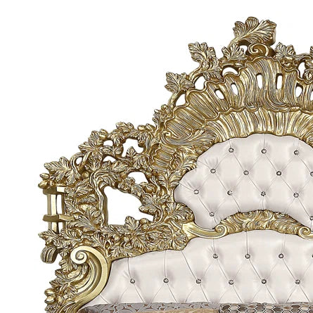 Retreat to this beautifully carved, rich gold, old-world bedroom collection. A grandiose bed adorned in a creamy ivory leather tufted with crystals, a gorgeous vanity fit for a queen, and soft close drawers in the dresser & nightstand finish off this rich collection. Step into elegance.