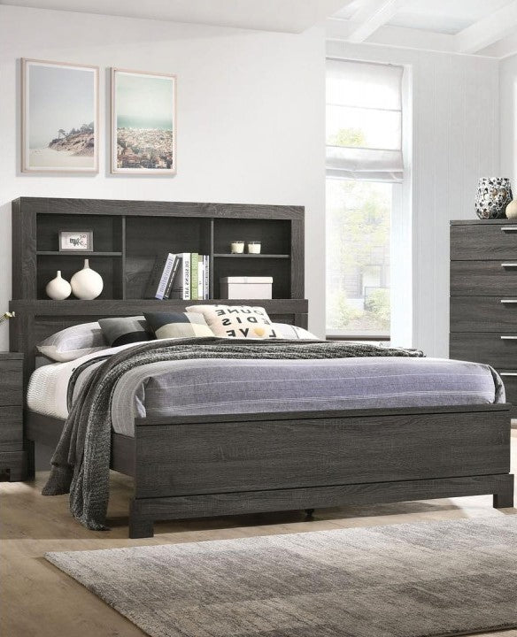 The Lantha bed presents a classic look, with a rectangular headboard bookcase and a low profile footboard made of natural hardwood with a grey oak finish. The headboard offers a range of open compartments, ideal for storing books, decorative items and display pieces.