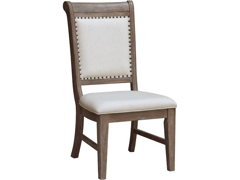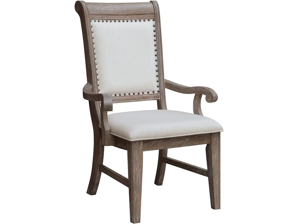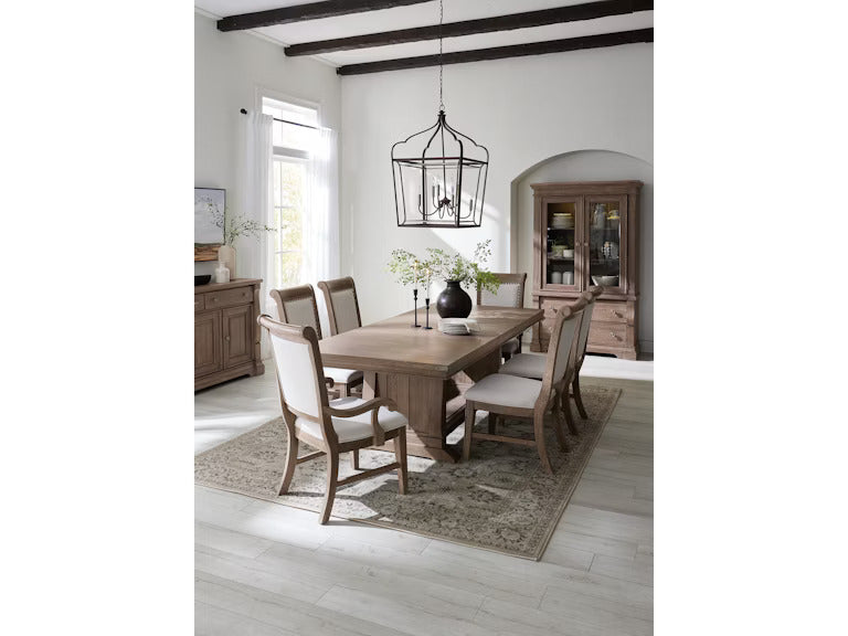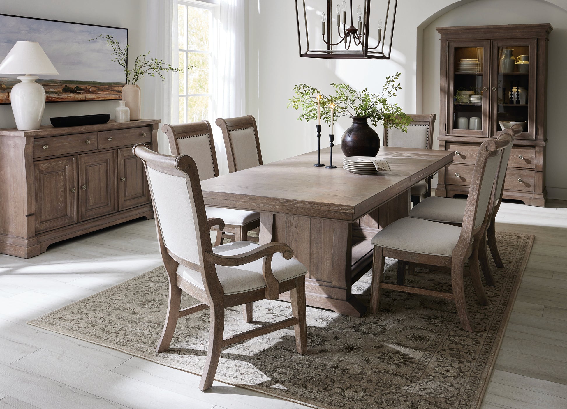 The Lawson's Creek dining room collection seamlessly blends farmhouse style with transitional design, resulting in an inviting atmosphere. Its weathered oak finish and aged pewter accents add a timeless charm and warmth to its overall look. The use of heavy crown molding creates depth and shadow, further enhancing the group's overall appearance.
