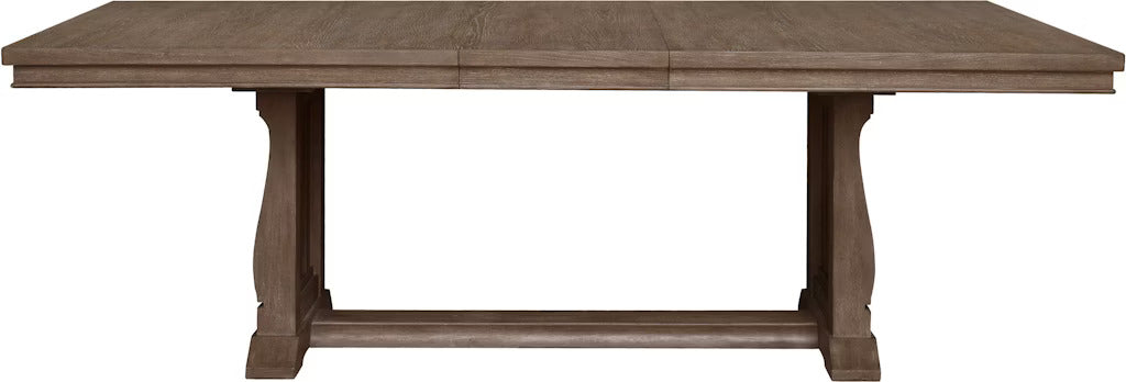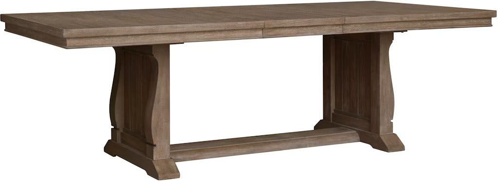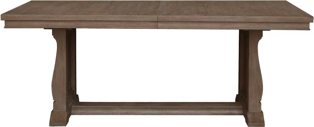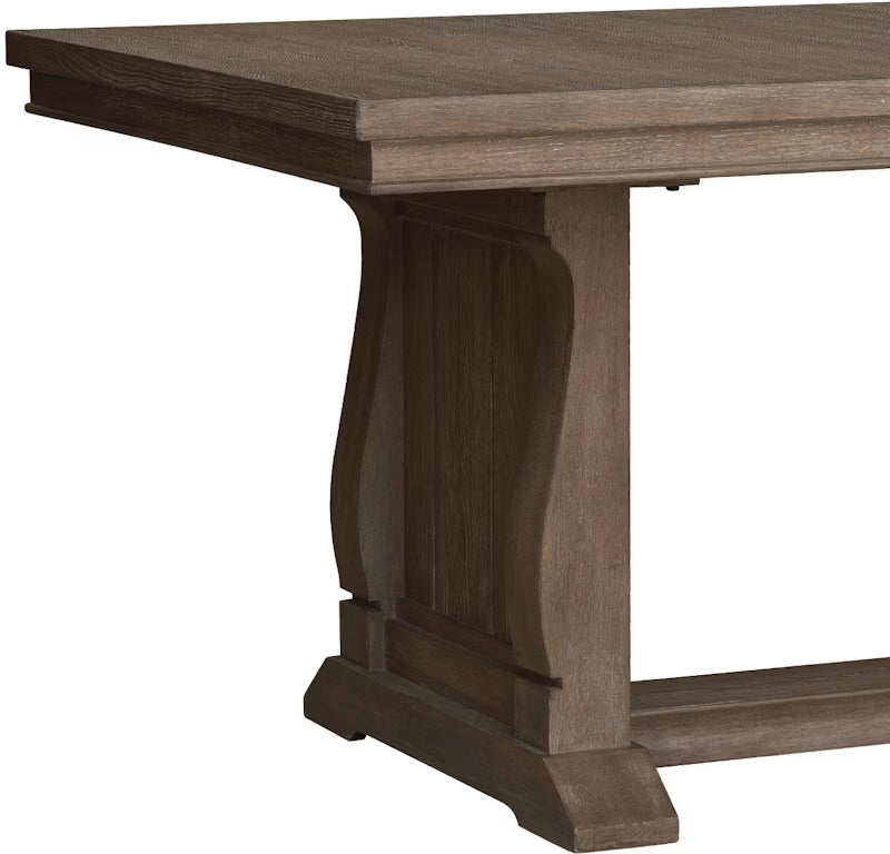 The Lawson's Creek Trestle Table is a versatile and elegant piece that combines farmhouse charm with timeless beauty. It features an 18-inch leaf that can be used to extend the table for larger dining surfaces during both everyday use and special occasions. With heavy pilasters providing a strong foundation and adding a touch of architectural interest, this table boasts durability and stability with its rubberwood solids and split heart oak veneers. Its transitional and farmhouse styles come together to create a timeless appeal for any dining area.