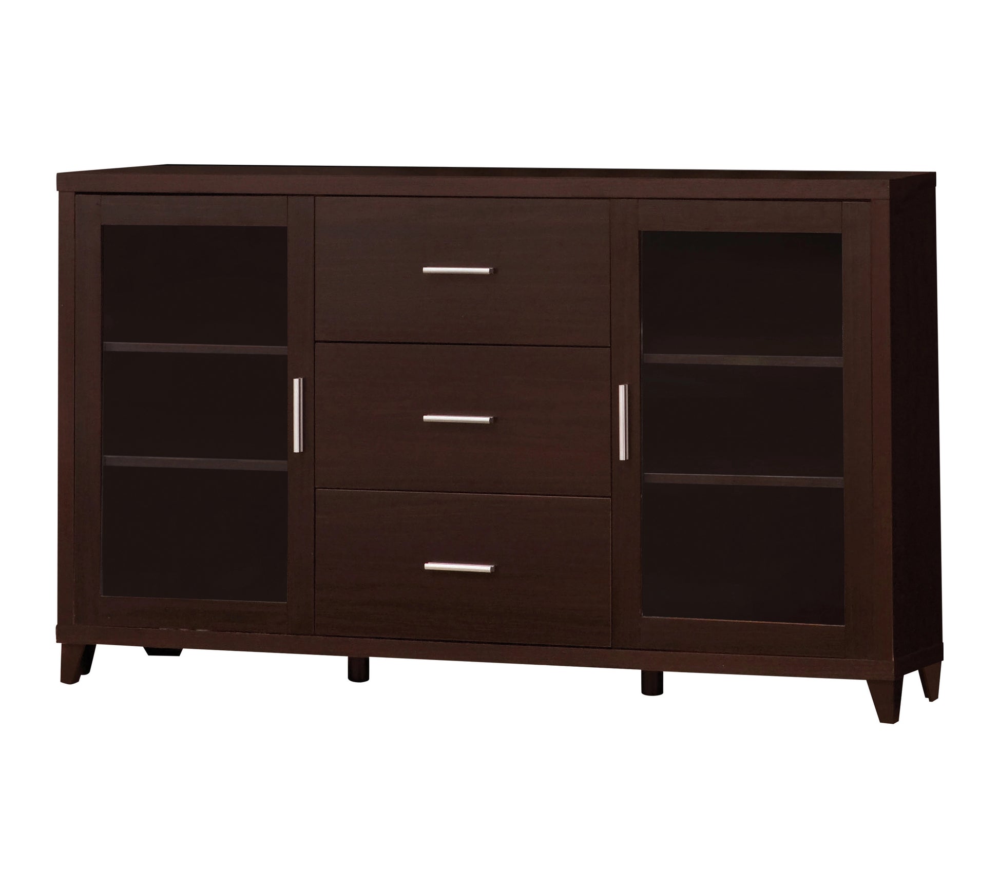 - TV console features 2 clear tempered glass framed doors with 4 height adjustable shelves & 3 storage drawers