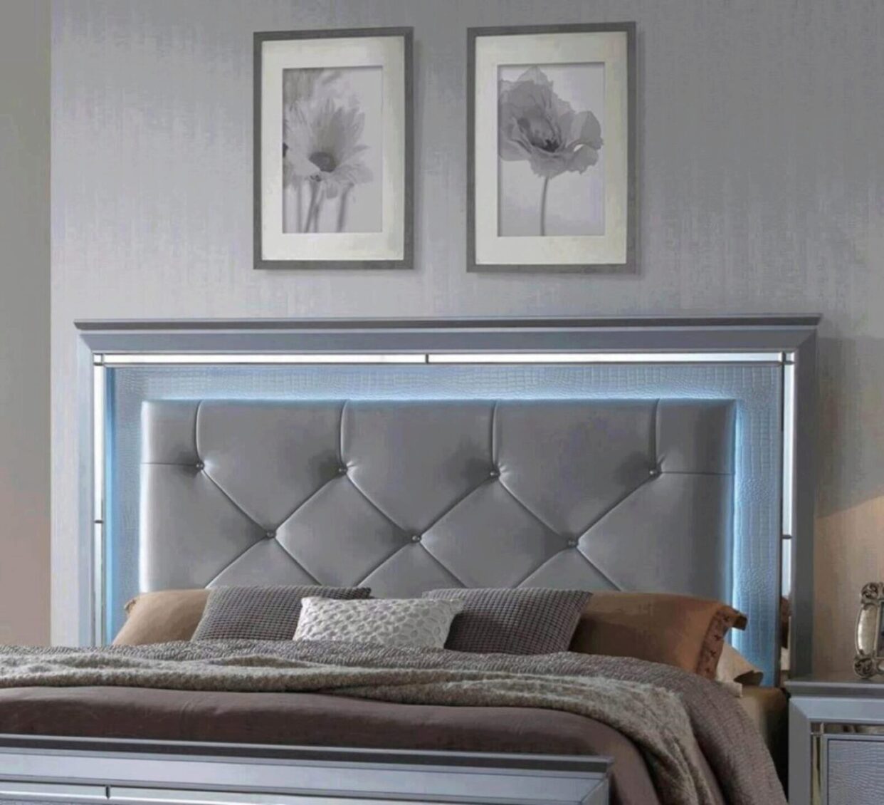 This dazzling bed will be a perfect centerpiece in your glam style bedroom. Featuring charming details such as beveled mirror accents & a silvery crocodile skin finish, this bed is glam to the max. Relax against the upholstered headboard with diamond tufting, illuminated by a built-in LED backlight. Pair this bed with the nightstand with a night light from this collection for a distinctive bedroom set. The Lillian bedroom collection by Crown Mark furniture has a glamorous look! This bed is finished in a silver crocodile finish. The set is accented with faux crystal pieces & surrounded by LED light on both the mirror & padded tufted headboard. Each case piece is accented with a beveled glass mirror to give this set the glam your room needs!