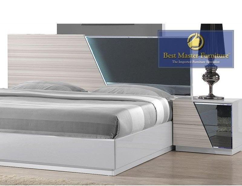 Zebra Gray with White Lacquer. Headboard has LED Lighting & Smoked Mirror