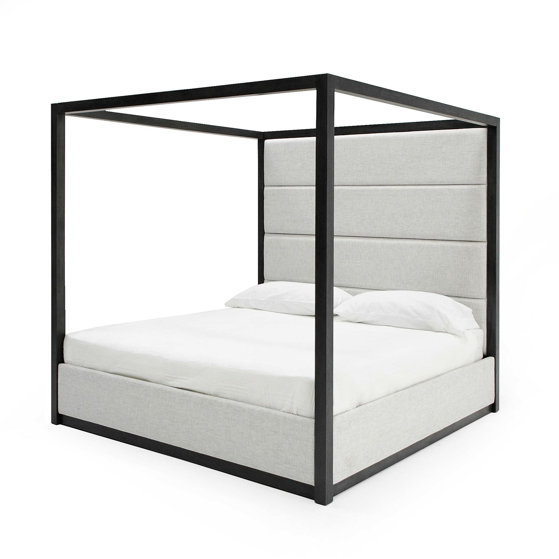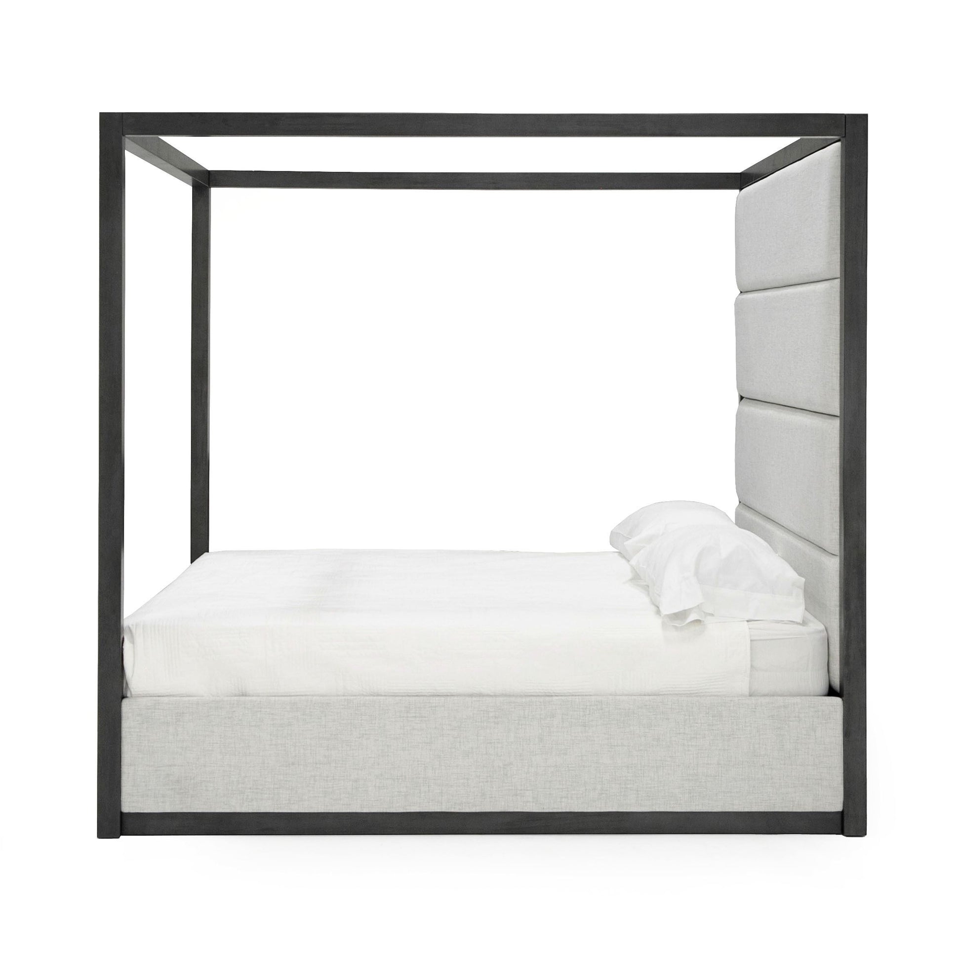Our Manhattan Canopy Bed set is designed to provide the utmost comfort and luxury. The headboard and soft mattress combine to create the perfect spot for unwinding and relaxing. The elegant ivory fabric upholstered platform offers cushioning, while the gray wood canopy surrounds you. With this set, you can rest assured to enjoy restful nights of sleep for years to come. It includes a bed, two nightstands, a dresser, and a mirror, all with a matching gray wood finish. It's available in both Eastern King and Queen sizes, and does not require a box spring since slats are provided.